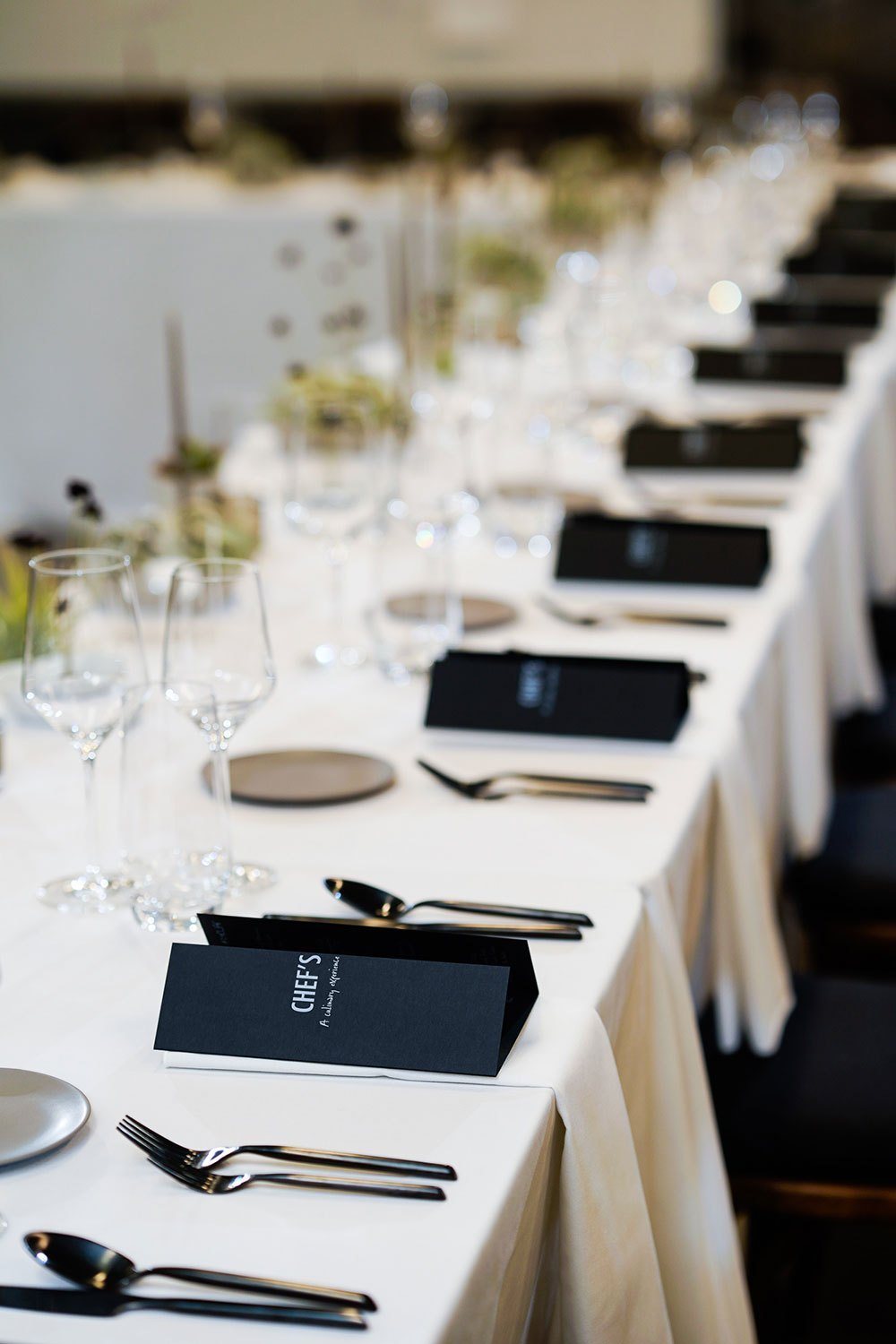 To make the occasion truly personal and intimate, the dining tables were arranged so that guests were only seated along one side of the table, providing them direct views of the kitchen and the chefs hard at work. The tabletops were set with minimal decor and featured modern floral pieces and assorted air plants. Our Ink Flatware was paired with our grey Lisbon Stoneware and Opus Stemware at each place setting and a custom printed menu displaying what guests could expect to be served that evening completed the tabletop.