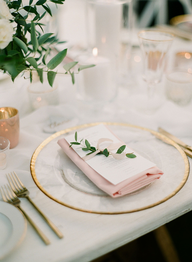 To add a touch of sophisticated glamour to the tabletop, Claire and Adam chose to incorporate subtle hints of gold. Our Oscar Gold Flatware was used throughout the reception and guests dined on our elegant Buckingham Plates paired with the Hammered Gold Rim Glass Chargers. Additional texture was added to the tabletop through our Gold Rim Bella Glassware.
