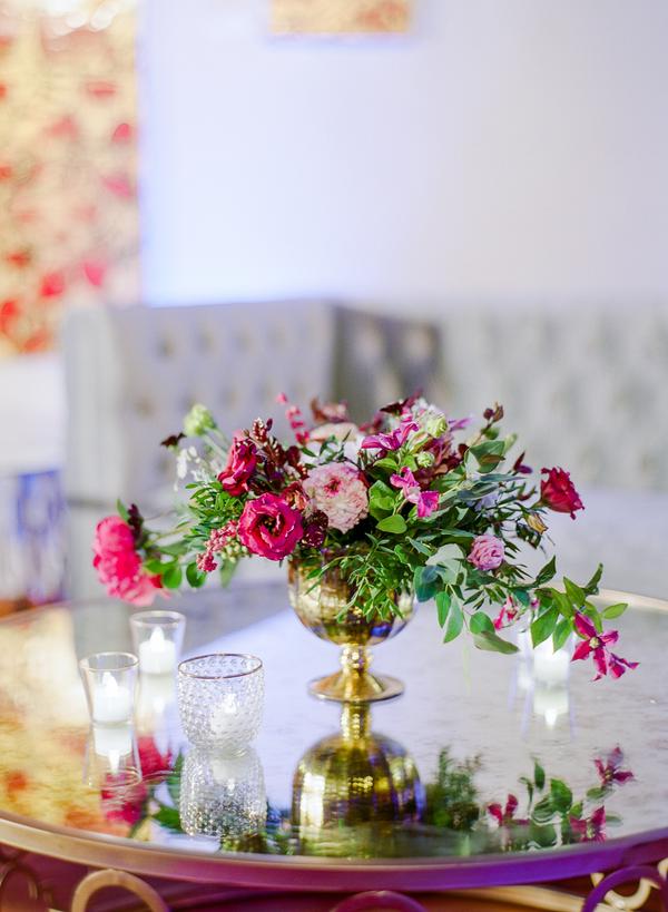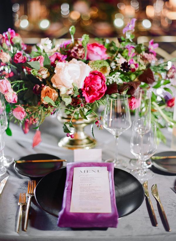 After the ceremony, guests made their way downstairs for cocktail hour, which featured high top tables with grey velvet tablecloths and large floral installations on both bars with custom gold and acrylic drink signs created by Underwood. Afterwards, guests made their way back upstairs to find the room transformed into a beautiful reception, with the drapery taken down and showing the art from the gallery on the walls and the dinner tables all brought in.