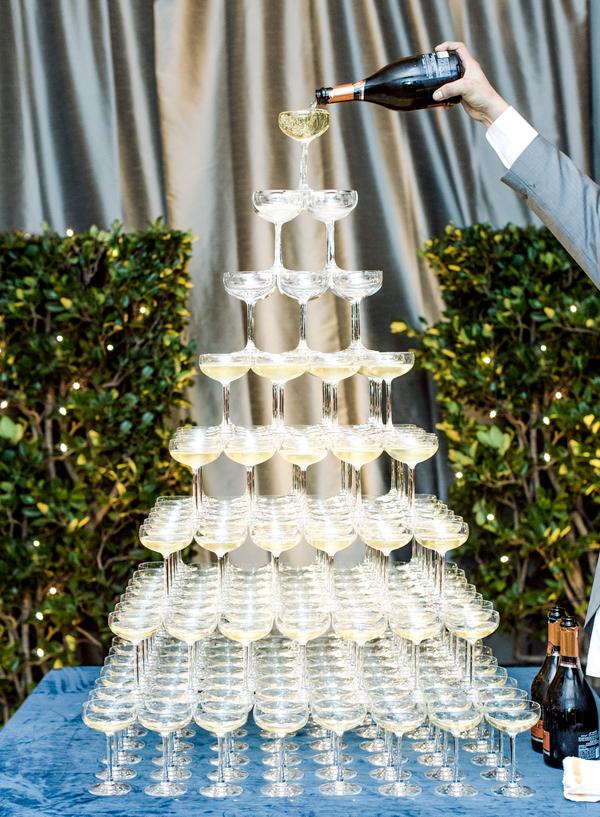 While guests dined upstairs, the cocktail space was transformed with lighting and new lounge furniture for an evening of dancing. A champagne tower was set up in the entrance to the dance floor and a large dessert table with all the bride and groom’s favorite desserts transformed the space. The newlyweds kicked off the night with parents’ dances and then their own first dance, before inviting everyone to the floor. Later in the evening, the couple’s friends led two special dances, including both the bride and groom crowd surfing and being thrown in the air during Magic Carpet Ride, and a group sing-along to Piano Man with all 200+ guests singing.