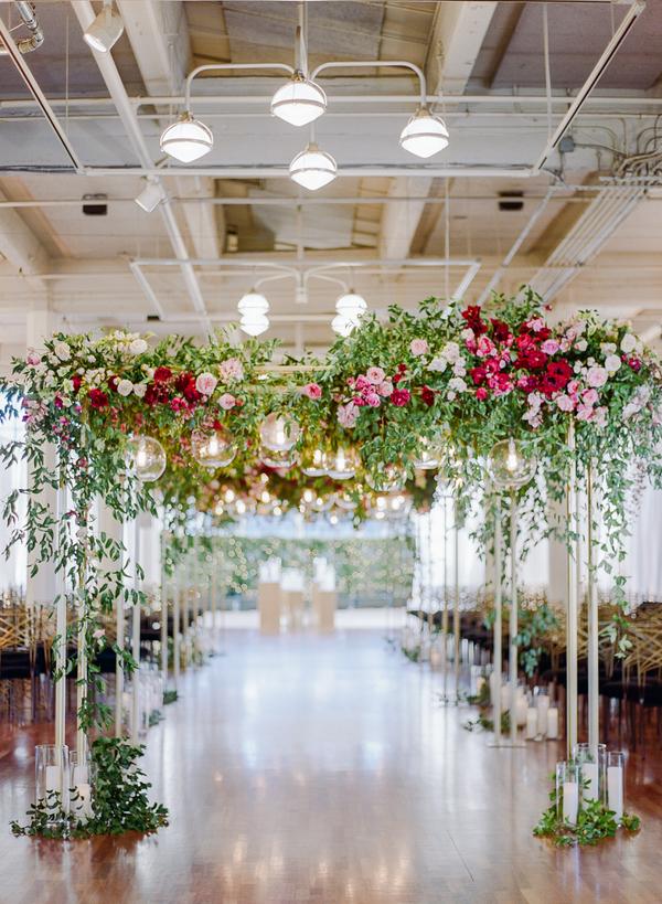 For the guests, the evening began with the ceremony on the upper level of the Terry Art Gallery at sunset. Cherries Flowers installed floral arrangements and lightbulbs from gold structures custom-made for the wedding. The sides of the room were all draped, hiding the walls and creating a more intimate space.