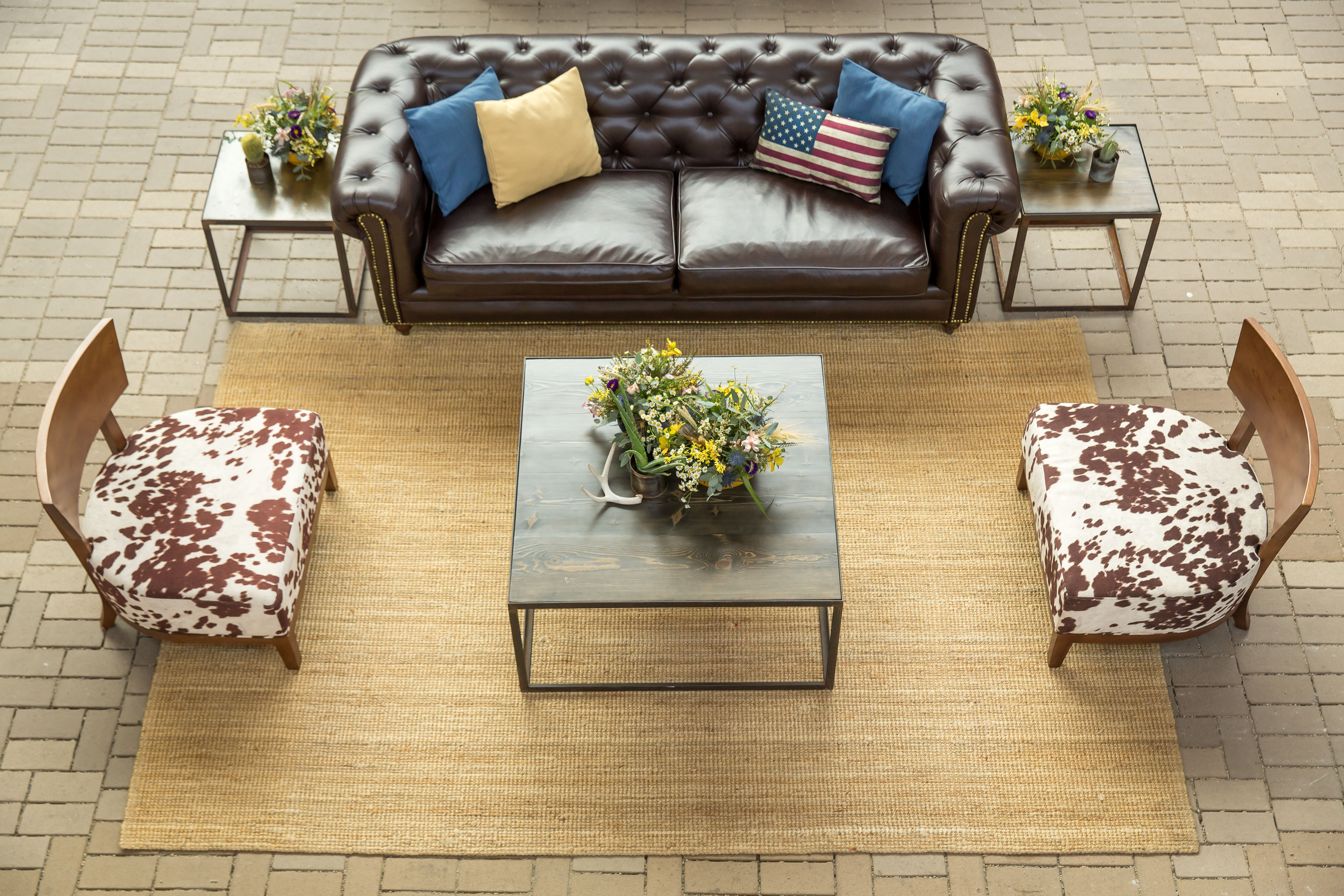 Rentals to Get the Look: Cambio bars and back bars with cowhide inserts, Jericho rugs, Sutton Sofa Tufted Brown Leather, Moo or White Sebastian Chair, Monte Carlo Brown Collection, El Dorado Flatware