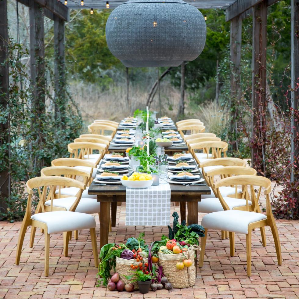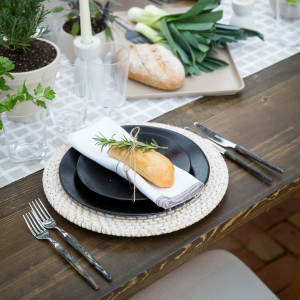 Create a memorable meal with rich brown-stained farm tables, rustic rattan chargers, and elegant black stoneware. Brown shed horned flatware adds an earthy touch, while Moroccan chandeliers provide a warm glow. Fresh herbs, vegetables, and stoneware platters bring the family-style feast to life.