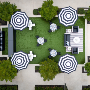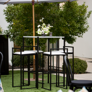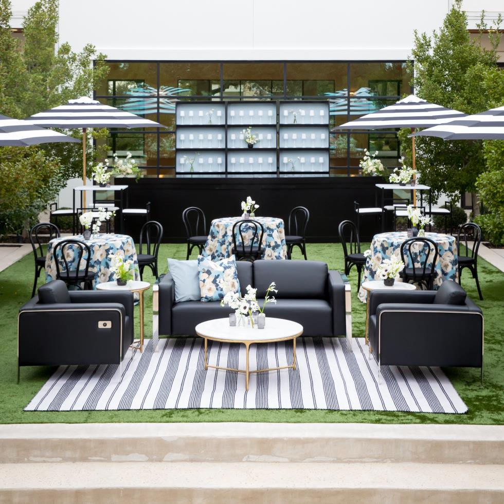 Step into a cocktail party where classic stripes meet modern sophistication. Striped umbrellas provide stylish shade, while light blue accents and floral linens add a fresh, vibrant touch. USB-friendly furniture ensures guests stay connected in style, blending practicality with elegance.