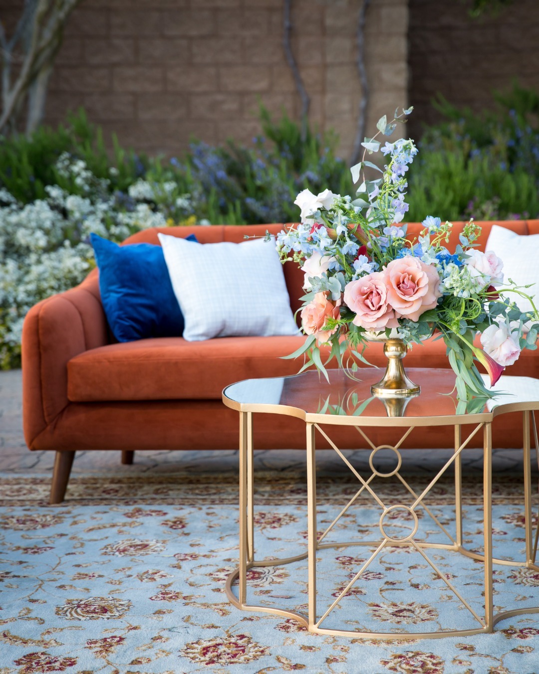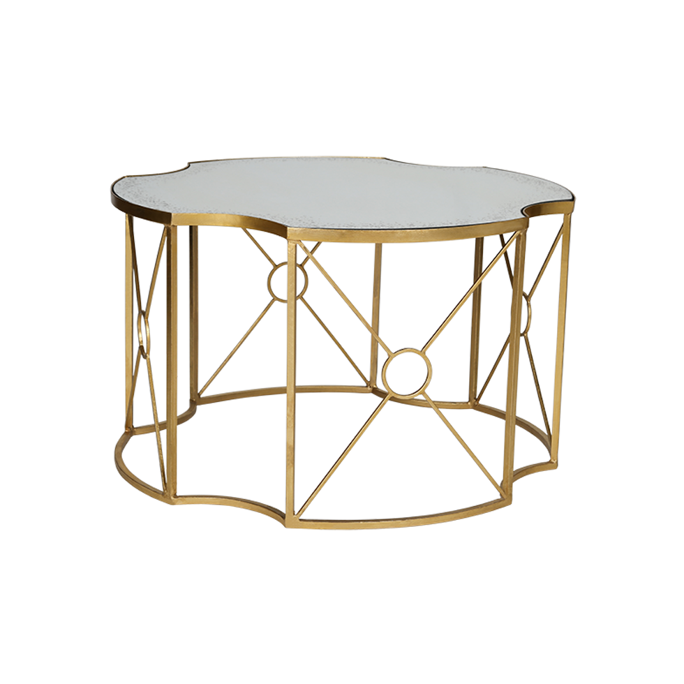 This quatrefoil shaped table has a clover-like shape that is evident in the antiqued mirror tabletop and base of the metal frames. These bases are made from iron and have a rich old gold leaf finish that is almost copper in color. The sides are reinforced with thin criss-crossing rods that intersect with a small ring in the center. The side table and optional coffee table will bring a luxurious feel to your lounge seating.