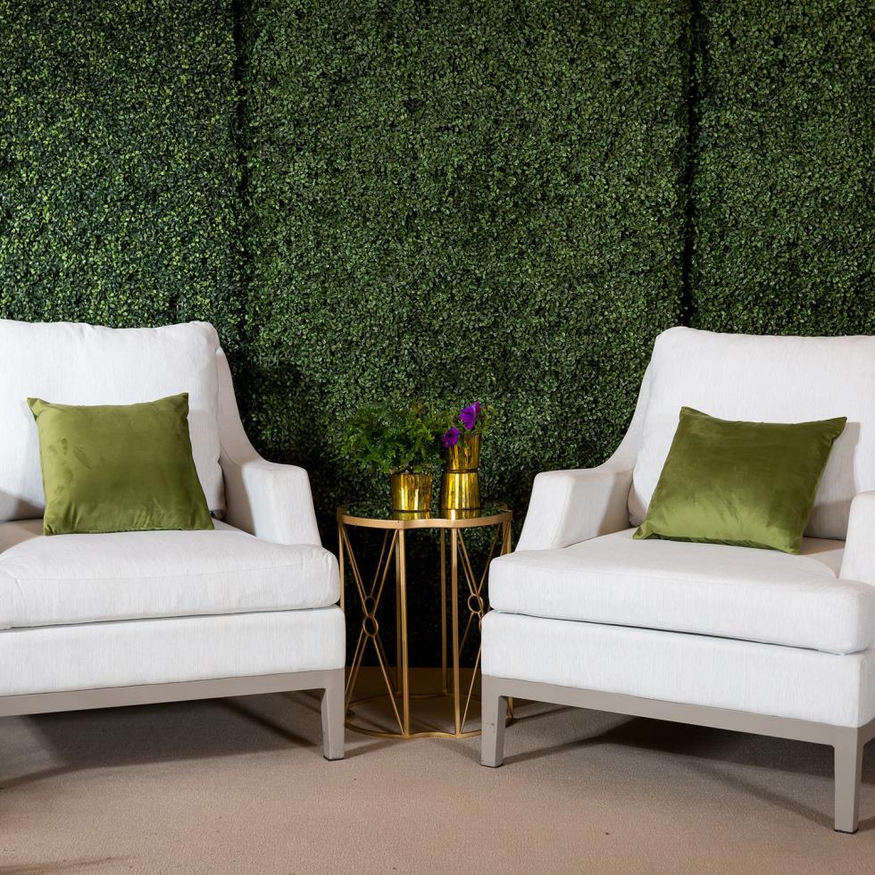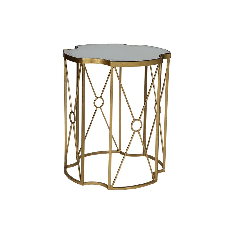 This quatrefoil shaped table has a clover-like shape that is evident in the antiqued mirror tabletop and base of the metal frames. These bases are made from iron and have a rich old gold leaf finish that is almost copper in color. The sides are reinforced with thin criss-crossing rods that intersect with a small ring in the center. The side table and optional coffee table will bring a luxurious feel to your lounge seating.