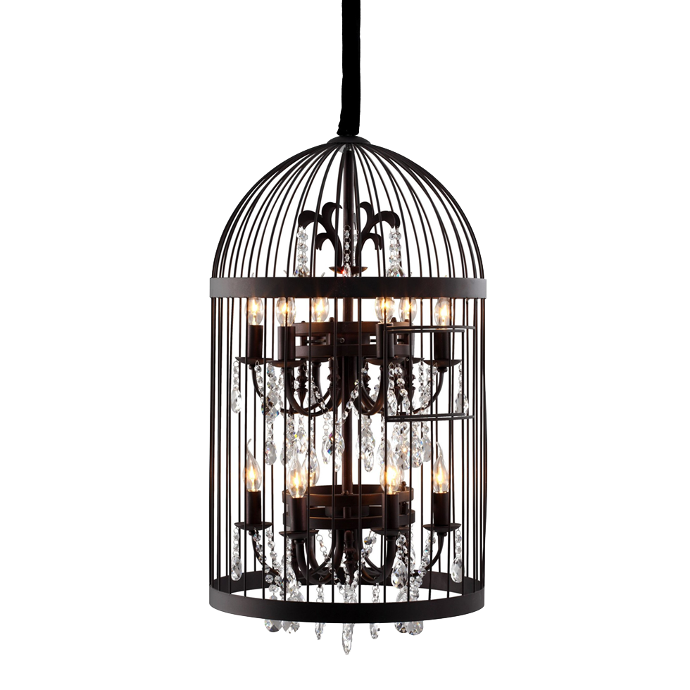 Inspired by a vintage birdcage, this rustic hand-wrought iron cage surrounds a cut-crystal faceted chandelier.