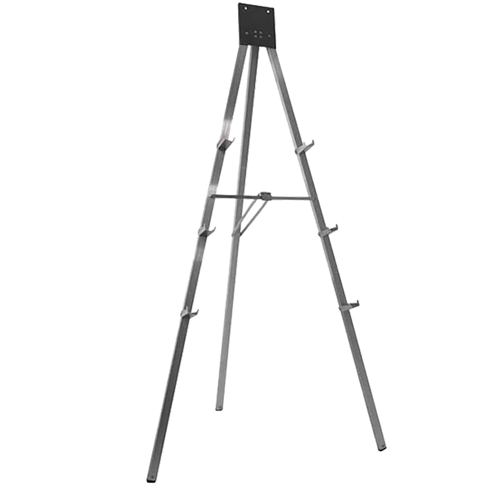 This Quick-Folding Easel is a great way to share information. From welcoming guests to presenting your next big idea. Made of rugged steel at the head-piece and rubber feet. This easel has three levels of hinged folding clips so you can place your signage in several locations. The clips also flip up flat when not in use. This is a representative photo of Bright's Aluminum Easel. Style may vary by location.