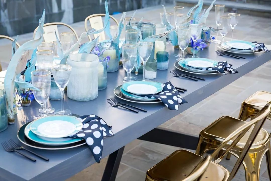 Bring the shades of the water to your dining table with stunning AQUA. Our Black and Turquoise Bright China, Black and White Domino Napkin, Parker Stemware,...