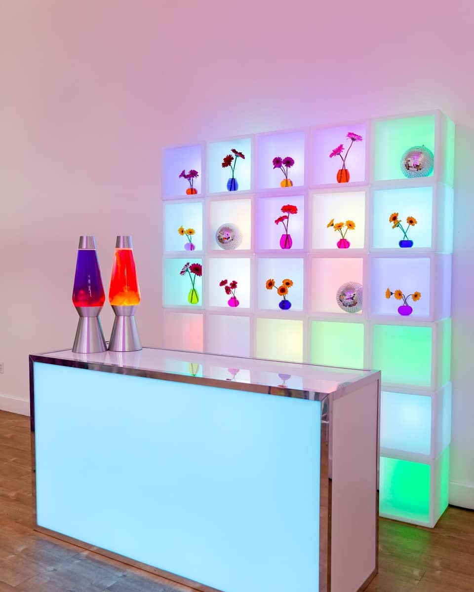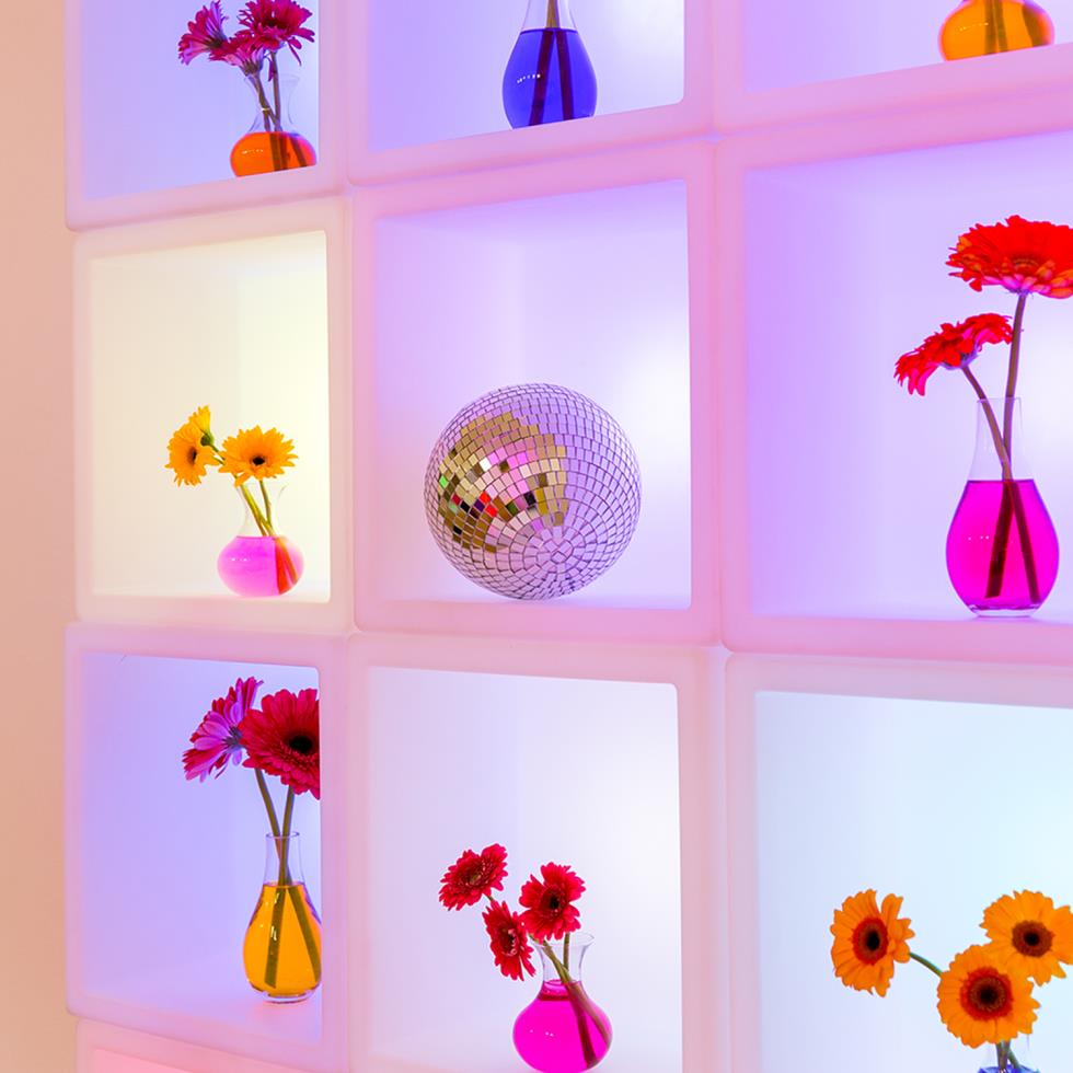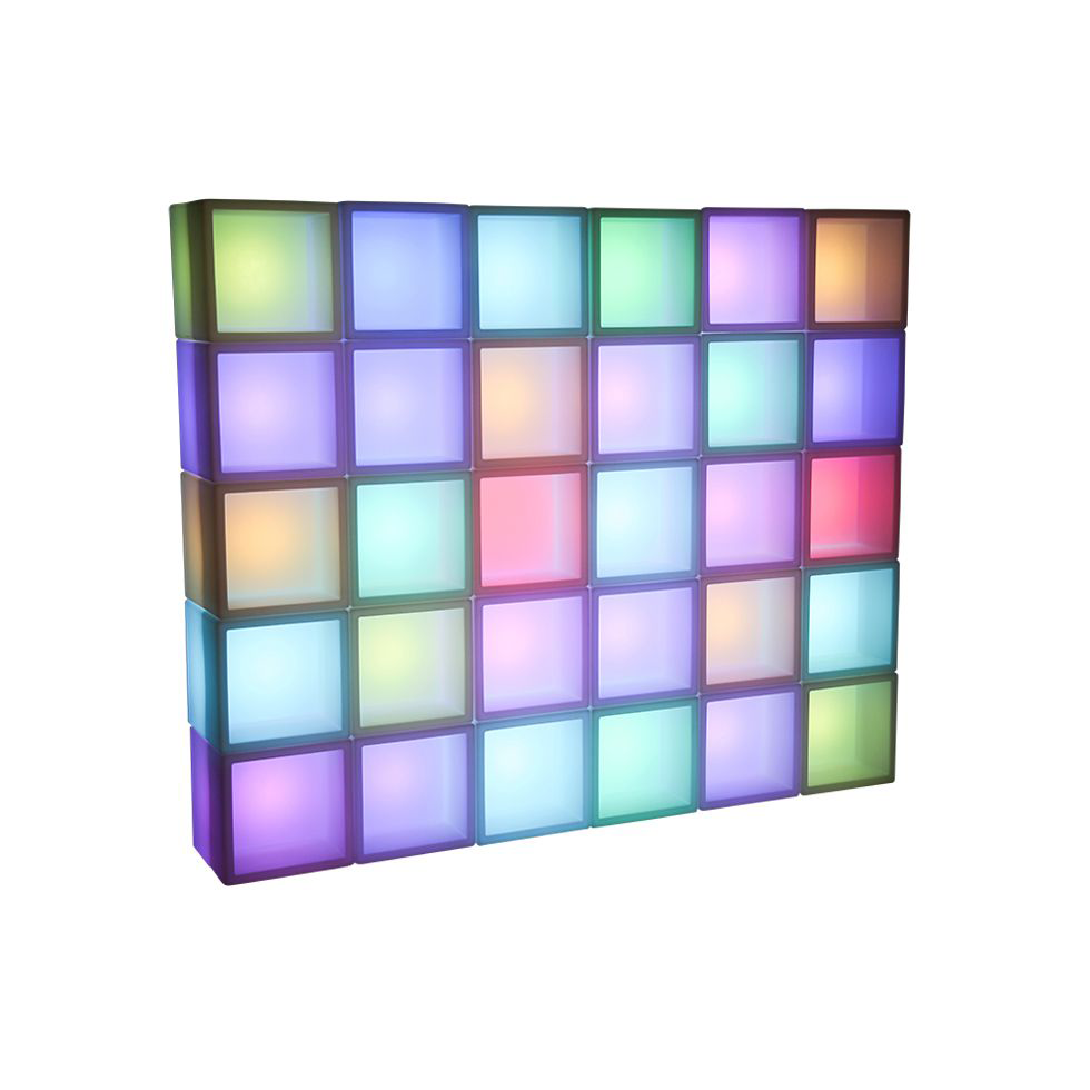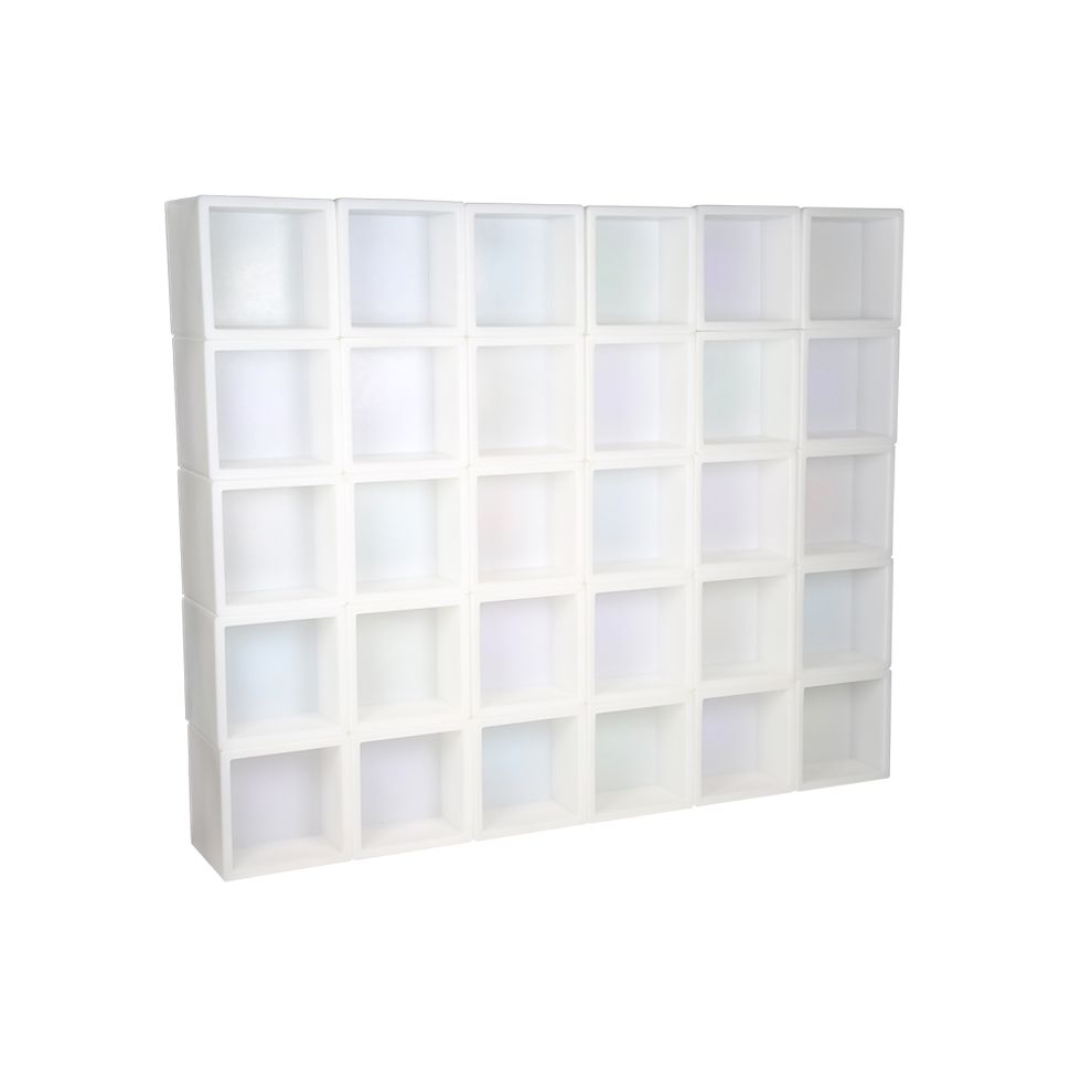 Our indoor/outdoor rechargeable lighting cubes can be lit in 16 different colors for at least 8 hours and is all managed by a handheld remote control. Set them to stay solid, change automatically, flash like a disco, or have the colors change in slow motion. Use one as a beverage chiller or top them with a white leatherette cushion to create stools or benches or have them stacked to create an Apollo Back Bar; any way you use them the Apollo cubes will have your celebration shining bright!