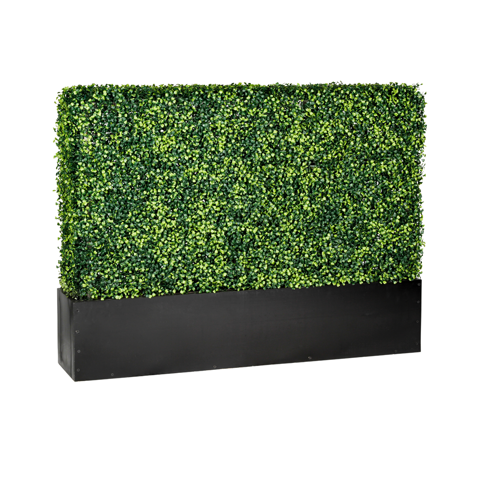 Beautifully create an entrance, transform a room, or hide an area with artificial hedges on both sides. The wood planter box is painted black and is weighted to keep hedges from tipping.