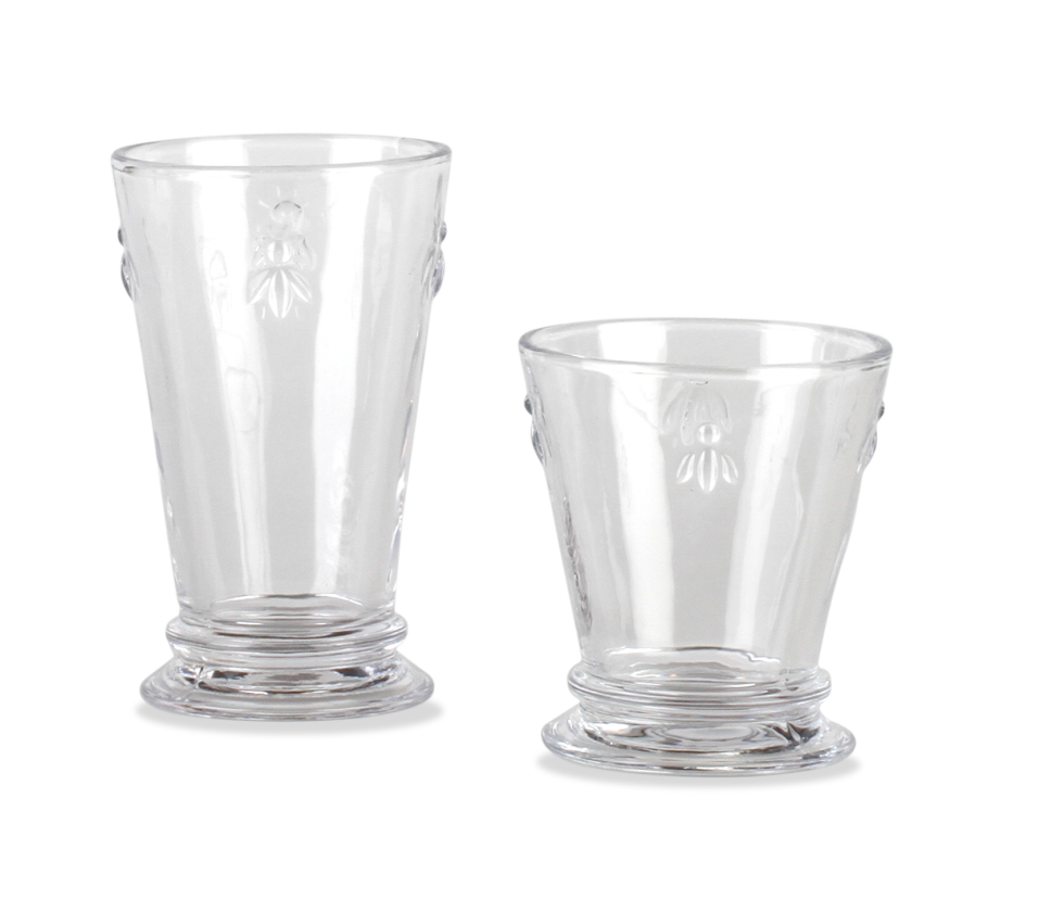 French inspired Bee glassware proudly displays the Napoleon symbol of l'abeille, the bee. Available in two sizes perfect for welcome beverages, at the bar, as a water glass, or fun addition to a "rustic" tabletop design.