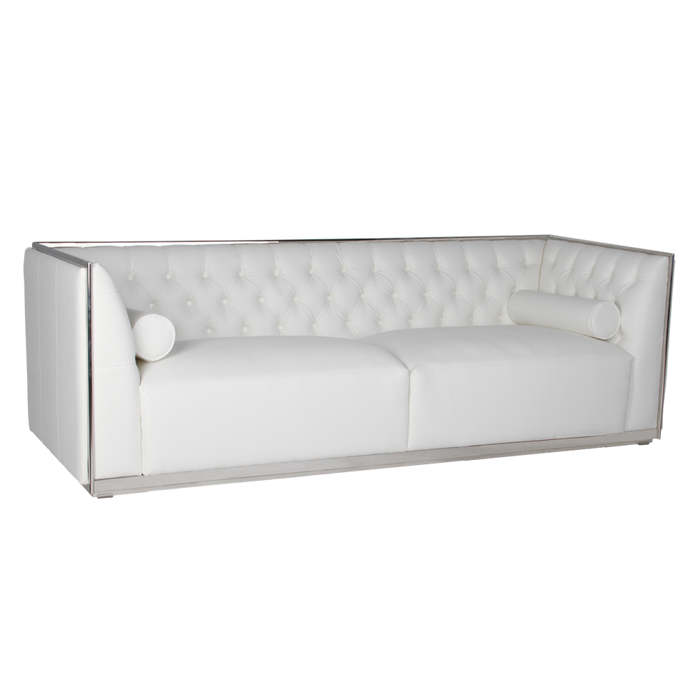 Modern classic sofa in white nobility bonded leather features deep button tufting and four cushions. A surrounding stainless steel frame creates a contemporary and streamlined look.