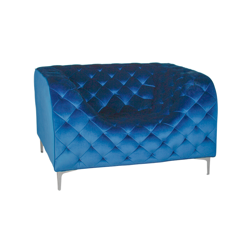 Chair features a plush tufted design on seat and back with a sleek modern low profile, upholstered in shiny poly-silk/velvet accented and finished with slim stainless steel feet.