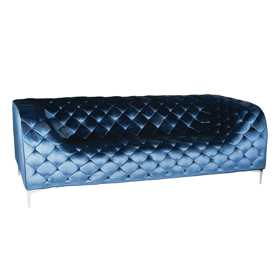 Sofa features a plush tufted design on seat and back with a sleek modern low profile, upholstered in shiny poly-silk/velvet accented and finished with slim stainless steel feet.