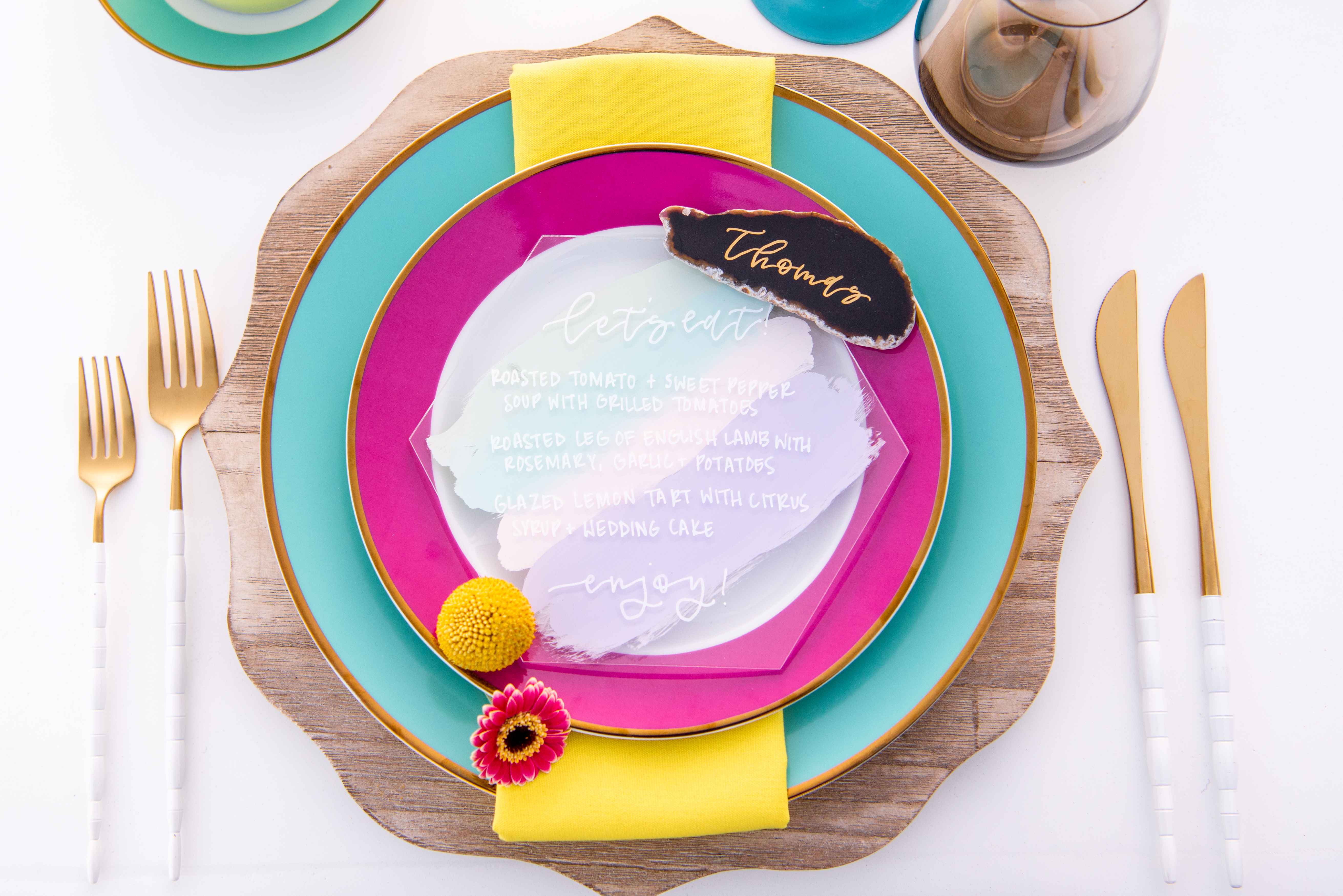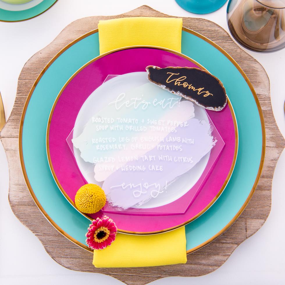 The dynamic Bright Collection is a modern twist on traditional pieces. Crisp, white china is punctuated with bold color bands and accented with gold rims allowing for a multitude of mix and match color combinations. Available in black, green, turquoise, orange, purple and pink. Note: Purple available in dinner and salad plate. Pink and orange available in a salad/dessert plate only.