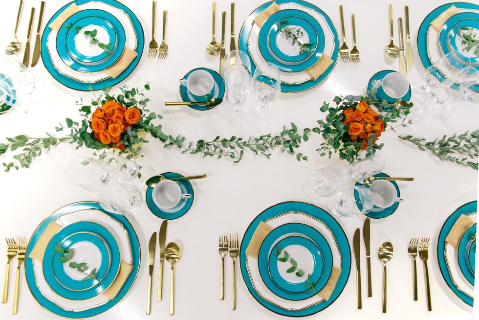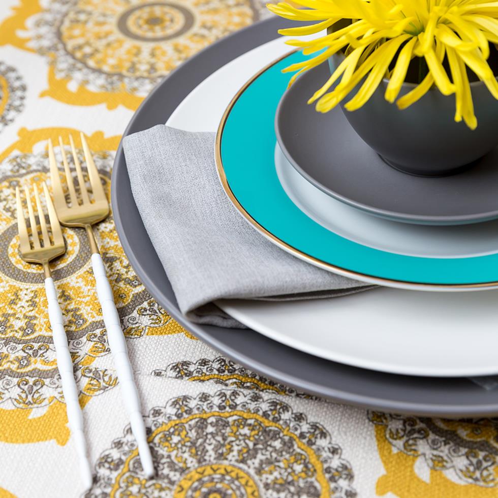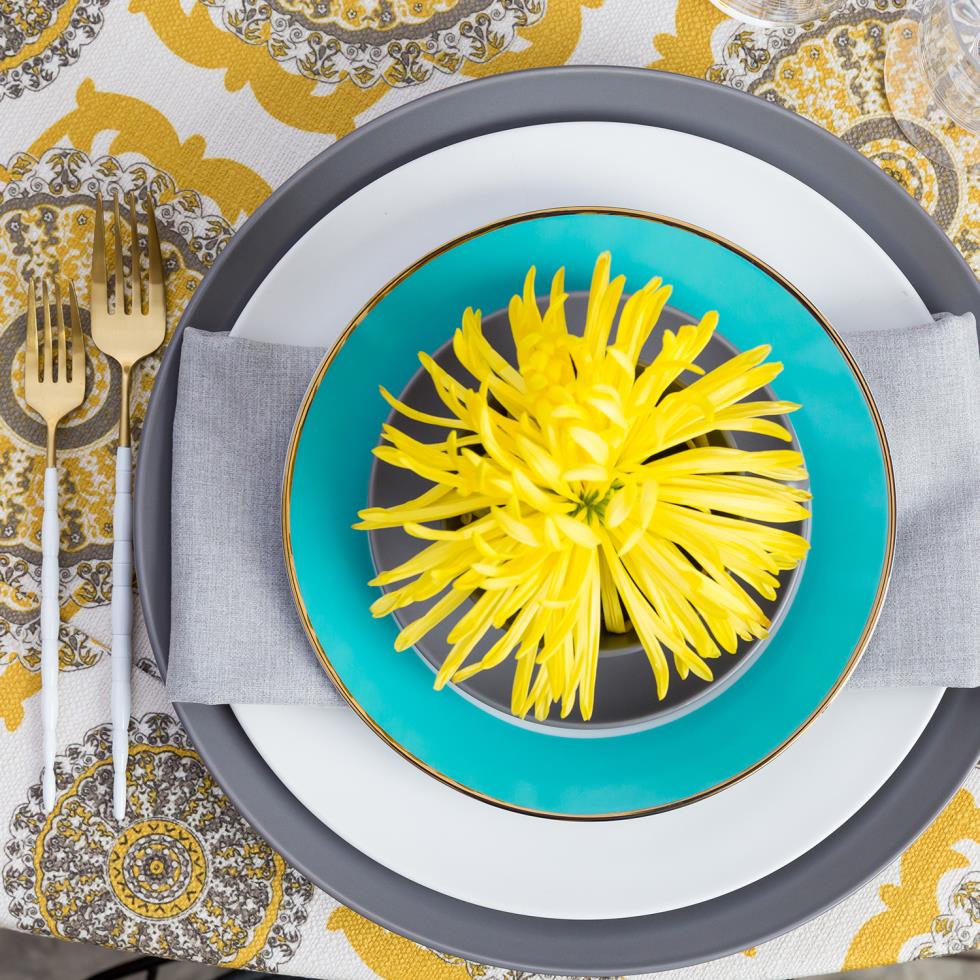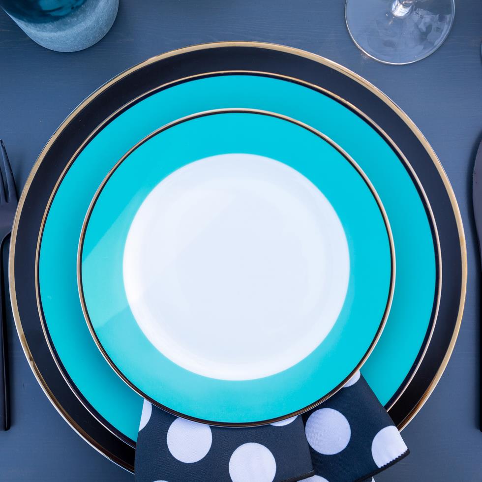 The dynamic Bright Collection is a modern twist on traditional pieces. Crisp, white china is punctuated with bold color bands and accented with gold rims allowing for a multitude of mix and match color combinations. Available in black, green, turquoise, orange, purple and pink. Note: Purple available in dinner and salad plate. Pink and orange available in a salad/dessert plate only.