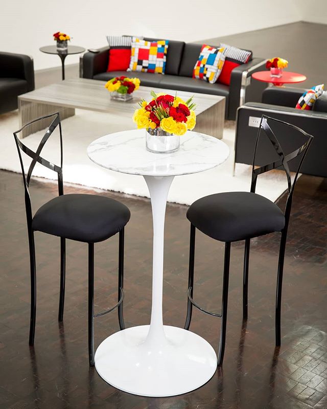 Our marble-topped Carrara Cocktail Table paired with classic Black \X\ Barstools will elevate your next event and take conversations to new levels. .