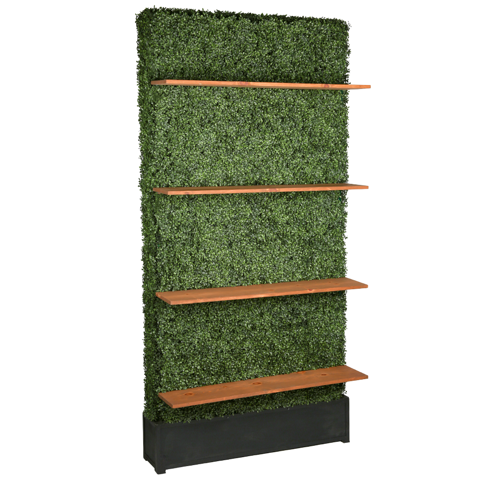 Welcome your guests with a glass of bubby as they arrive at your event or create an extra drink station using our Hedge Wall with Calistoga Stemmed Wood Shelf. This versatile unit features 4 shelves capable of holding up to 32 glasses. The hedge wall is double-sided, with shelving on one side for your convenience.