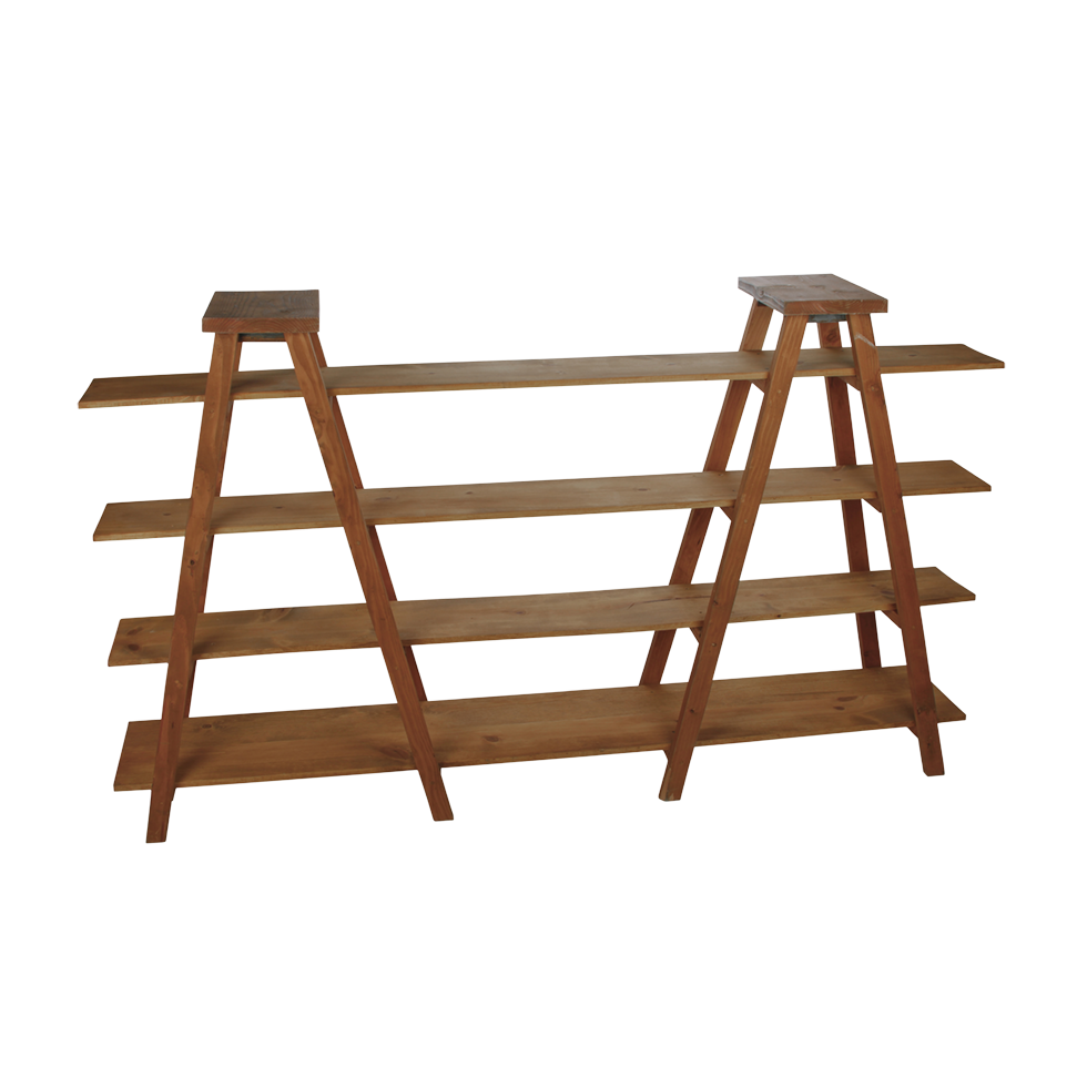 Display your glasses, liquor bottles, chalkboard signs, bar menu or create a double sided buffet using our ladder bar back display created from two ladders and four custom fitted shelves. Coordinates well with our line of Calistoga tables, benches and vintage accessories.