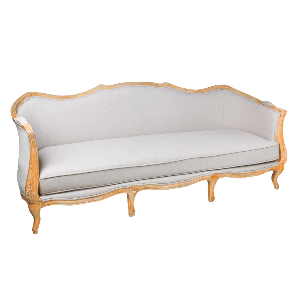 18th Century French design finds a contemporary update in our Chateau Sofa. It's classical shape and exposed wood frame is paired with lush modern fabric tones suited to either a Contemporary or Wine Country Chic look. Features solid oak legs detailed in a white wash distressed weathered oak finish for a natural look.