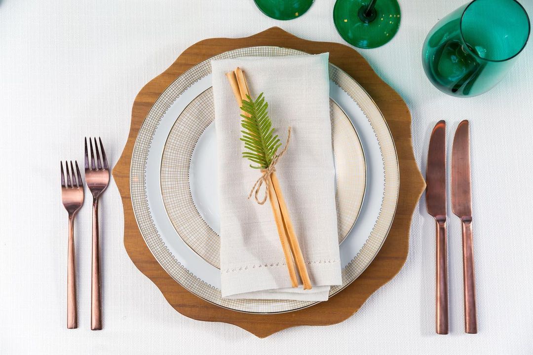 A modern culinary night in GREEN is best served with our Dark Acacia Wood Chargers, Calgary China, Santiago Flatware, and Kenwood Natural Napkin. Cheers...