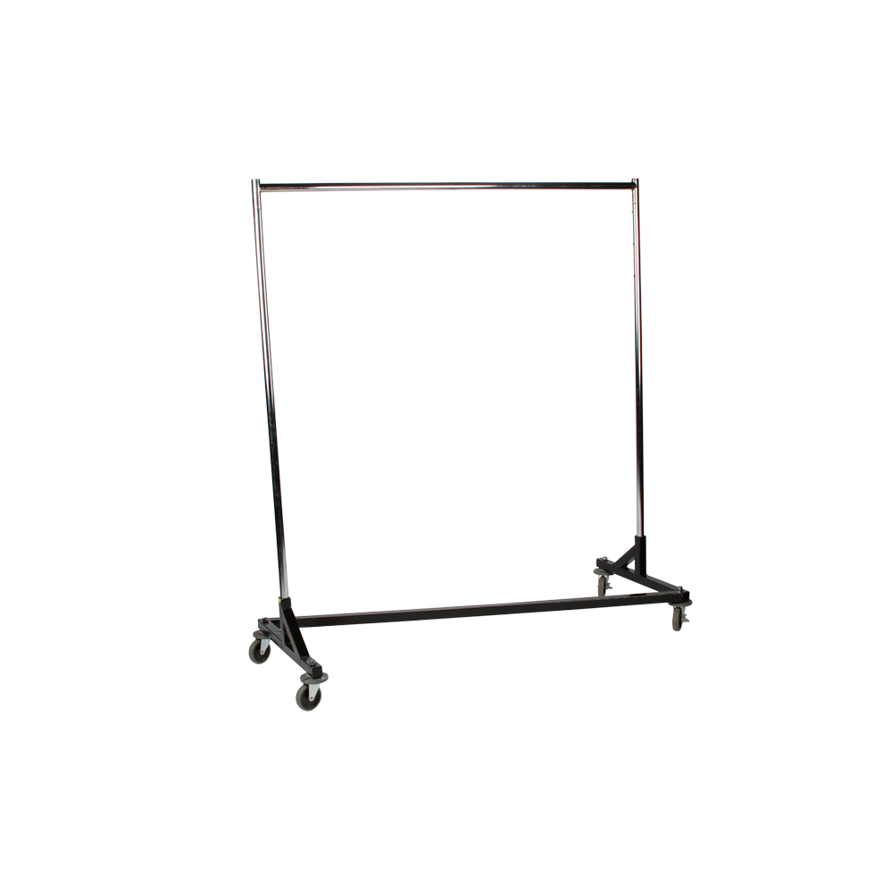 All metal commercial-grade garment rack with chrome colored 5-foot uprights and a black base. Unit has sturdy metal casters and large wheels make it easy to roll if necessary fully loaded with garments.