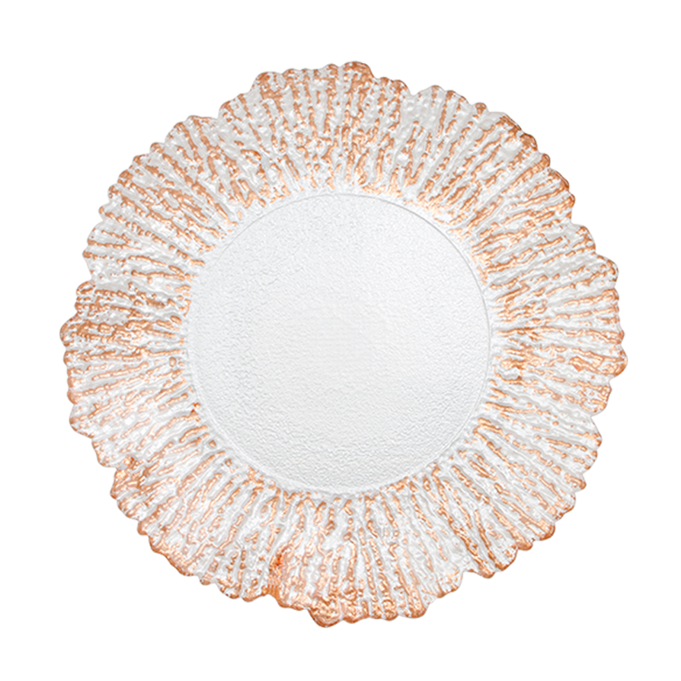 Make a statement with these textured Coral Rose Gold Chargers. White metallic with just a touch of Rose Gold on a sunbrust style glass charger for your rehearsal dinner, wedding, brunch or shower.