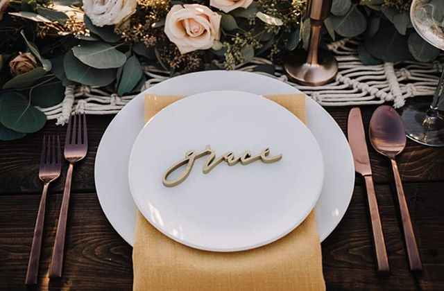 Our White Coupe China and Santiago flatware paired with mustard-yellow linens and lush greenery on a wooden table set a beachy tone to this tablescape