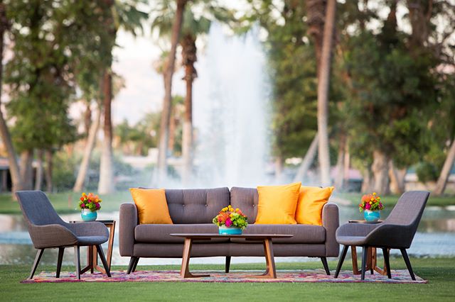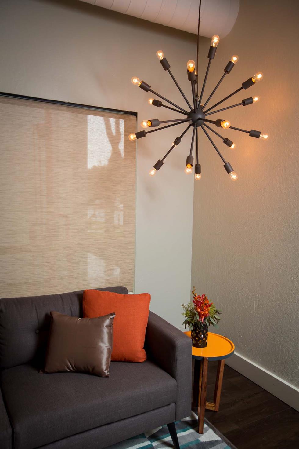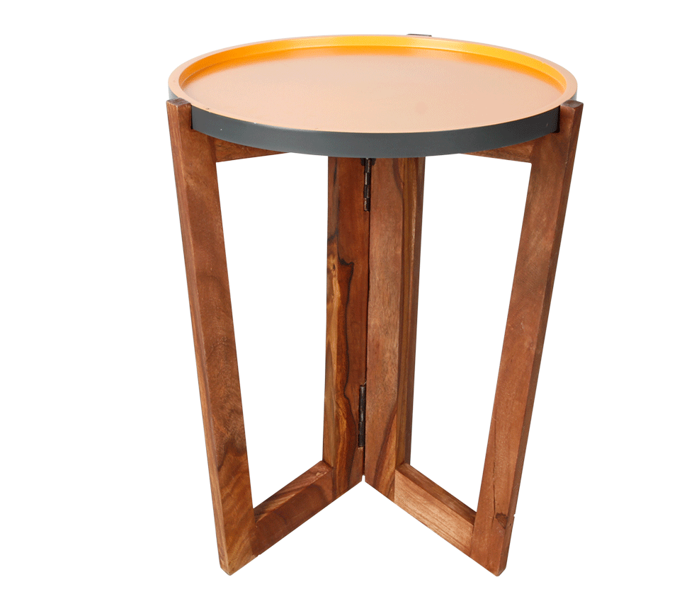A contemporary take on a mid-century modern classic. A uniqely shaped scuptural end table with wood legs and an orange/gray top for a pop of color.