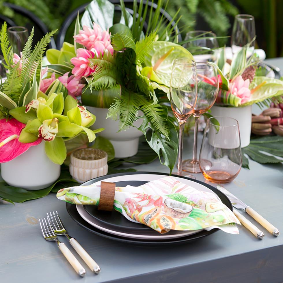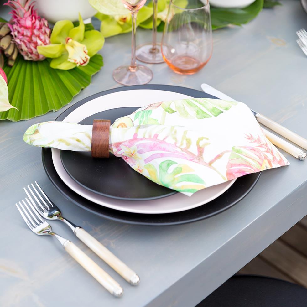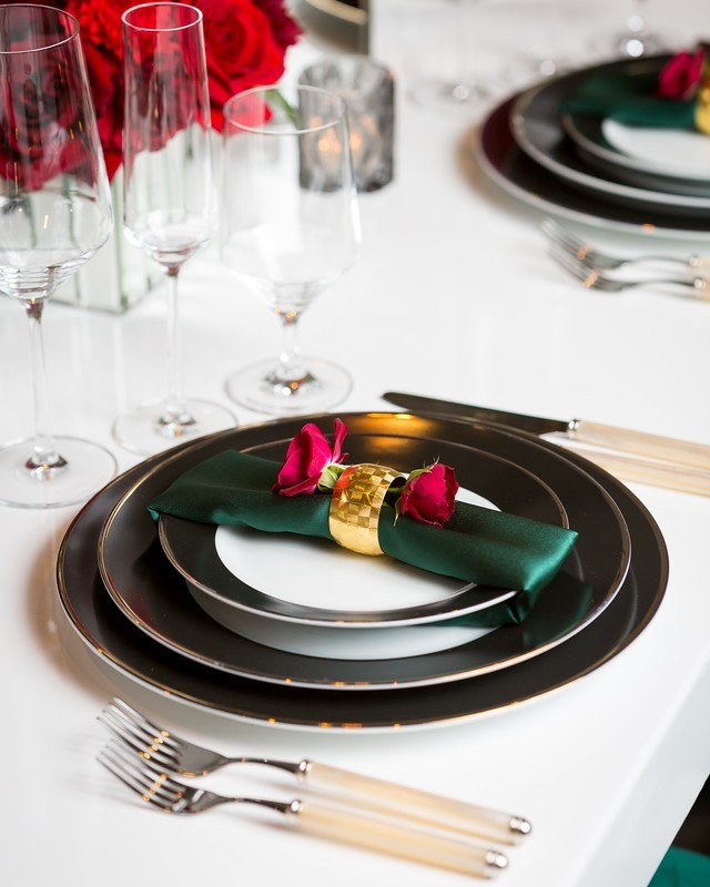 Our Black Bright China, Del Mar Flatware, and Boxwood Lamour Napkin set a distinctive table.