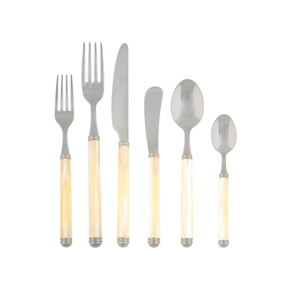 Our Del Mar flatware is made in Italy of 18-10 stainless steel and high quality, durable acrylic handle which look like mother of pearl. Perfectly balanced, it is the ideal choice for casual or formal dining.