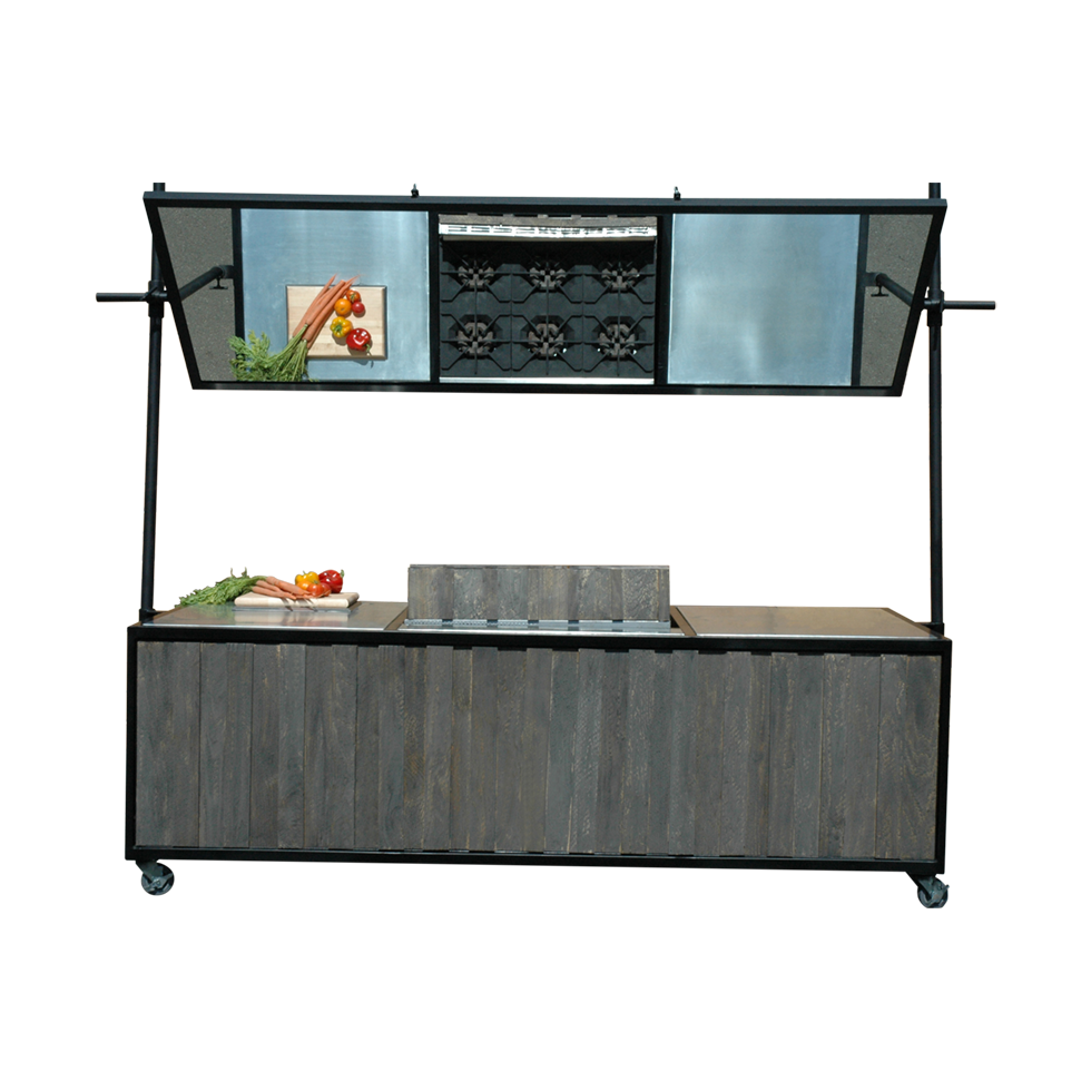 This beautiful, portable Demo Kitchen is just the right height to conduct food tastings, cooking demos, or classes anywhere. Overhead mirror is adjustable and can be angled to maximize visibility so your audience is fully engaged. Kitchen comes without an oven so that you are free to use your equipment. Range/ovens available upon request and at an additional charge. If no stove will be used, we recommend adding the "Demo Kitchen Insert" for a solid work surface. Insert available at an additional charge.