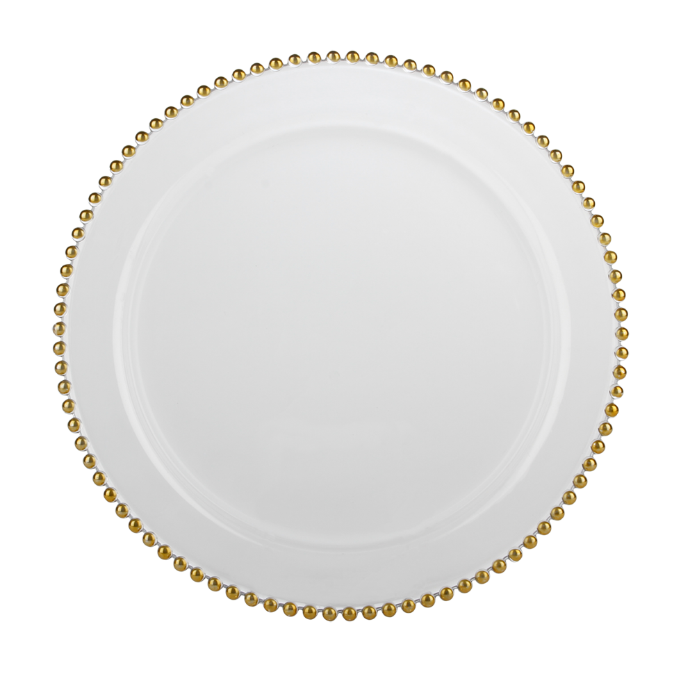 Delicate gold beading along the rim makes this clear glass charger plate a glamorous, glimmering accent for any table.