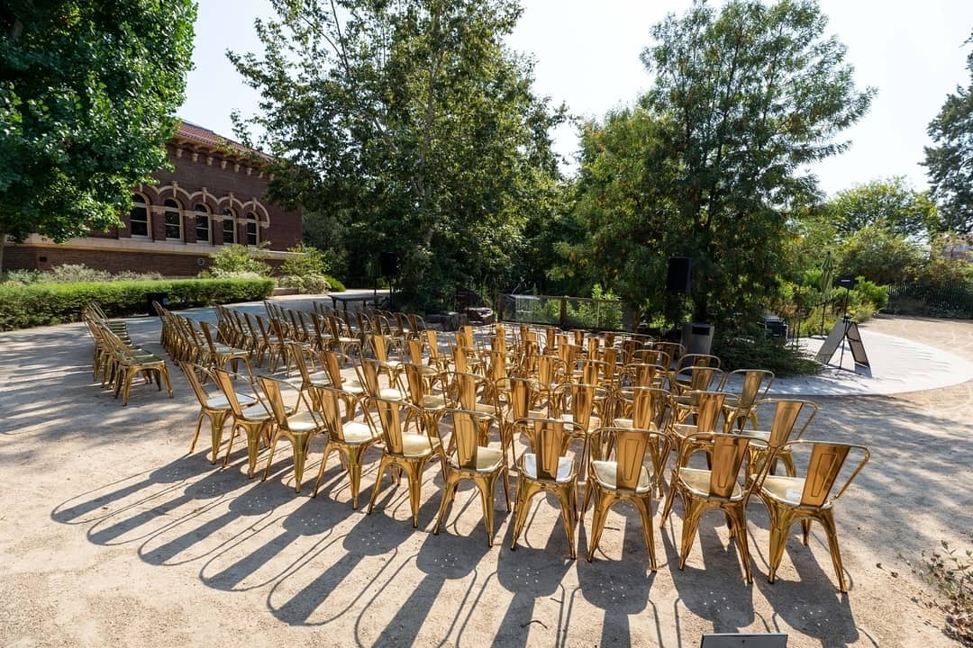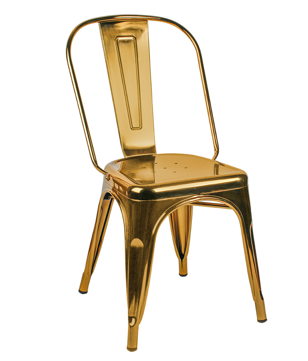 Originally made famous in the quaint bistros of France, these midcentury replicas of vintage style café seating will offer a dose of nostalgia. Featuring a curved back with vertical slat and drain holes in the seat. A cross brace underneath the seat adds extra stability while the Polished Gold finish blends beautifully with rustic or modern design.