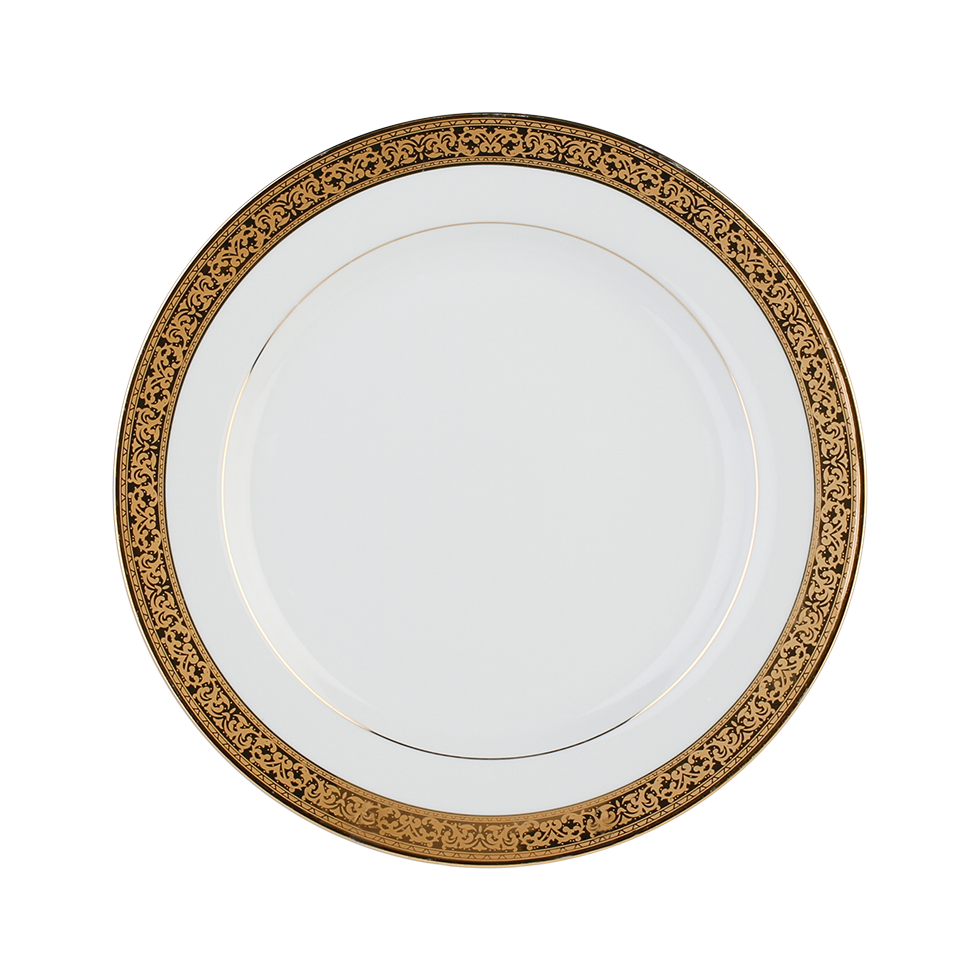 Contemporary fine china with a wide gold band that is rich with exquisite design and detail. This pattern is available in a full set of dinnerware.