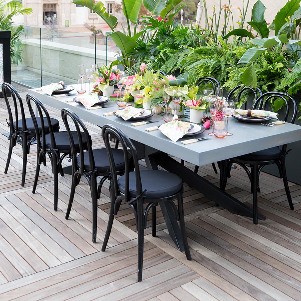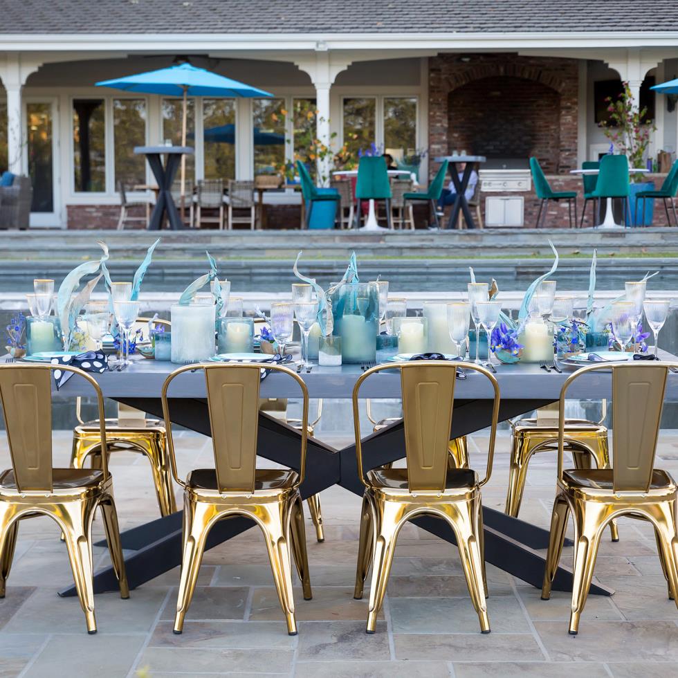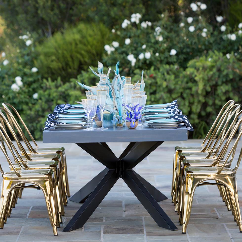 Bursting on to the scene with a sleek modern design, is our Starburst table. The criss-cross table base is not only beautiful, it brings a “wow” factor to your industrial or casual style dining experience. The Grey wash top with brass criss-cross legs brings art and function to your event design!