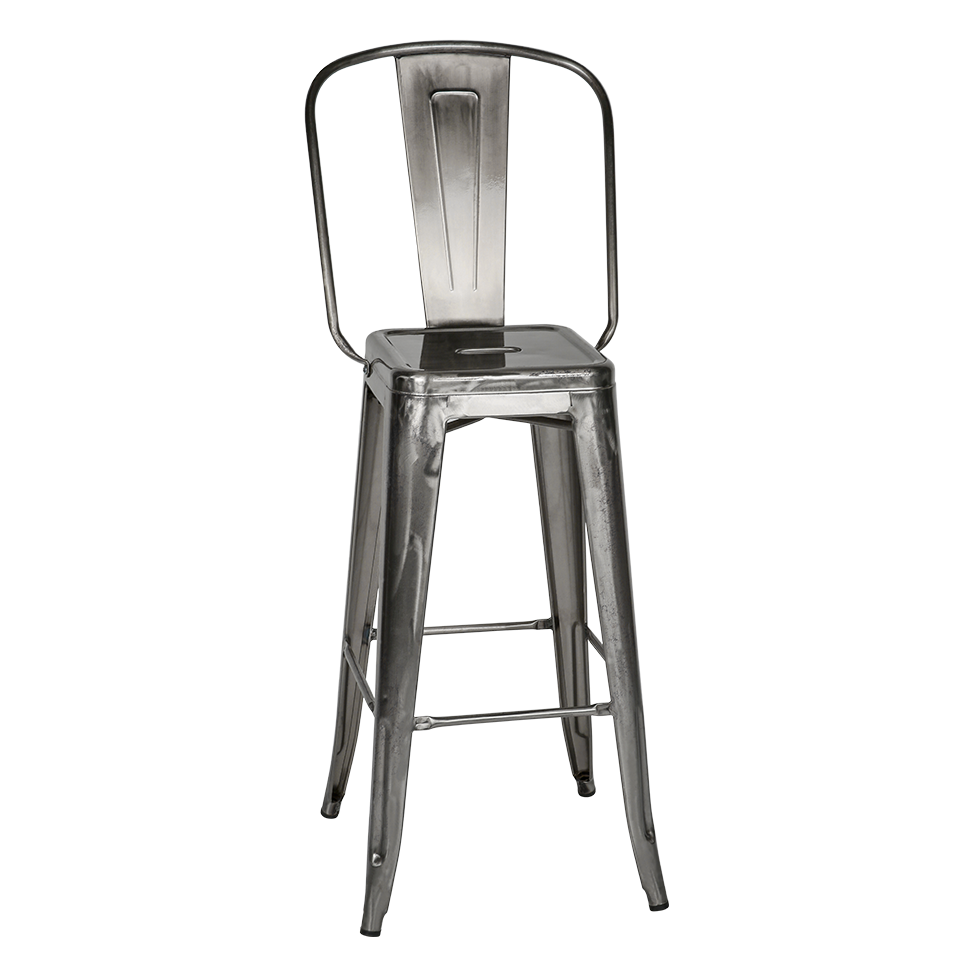This vintage style café bar stool offers a dose of nostalgia. Featuring a curved back with vertical slat and drain holes in the seat. A cross brace underneath the seat adds extra stability while the Gunmetal finish blends beautifully with rustic or modern design.