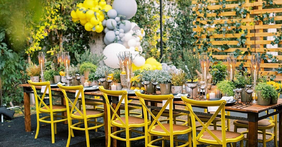 When life gives you lemons we incorporate them into the decor for a vibrant celebration featuring our Yellow Distressed Bistro Chair!