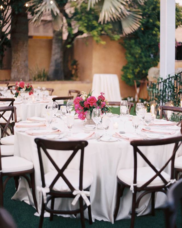 Round tables set with crisp, white linens, blush napkins, and low, colorful centerpieces were a perfect design for this romantic, alfresco reception at...