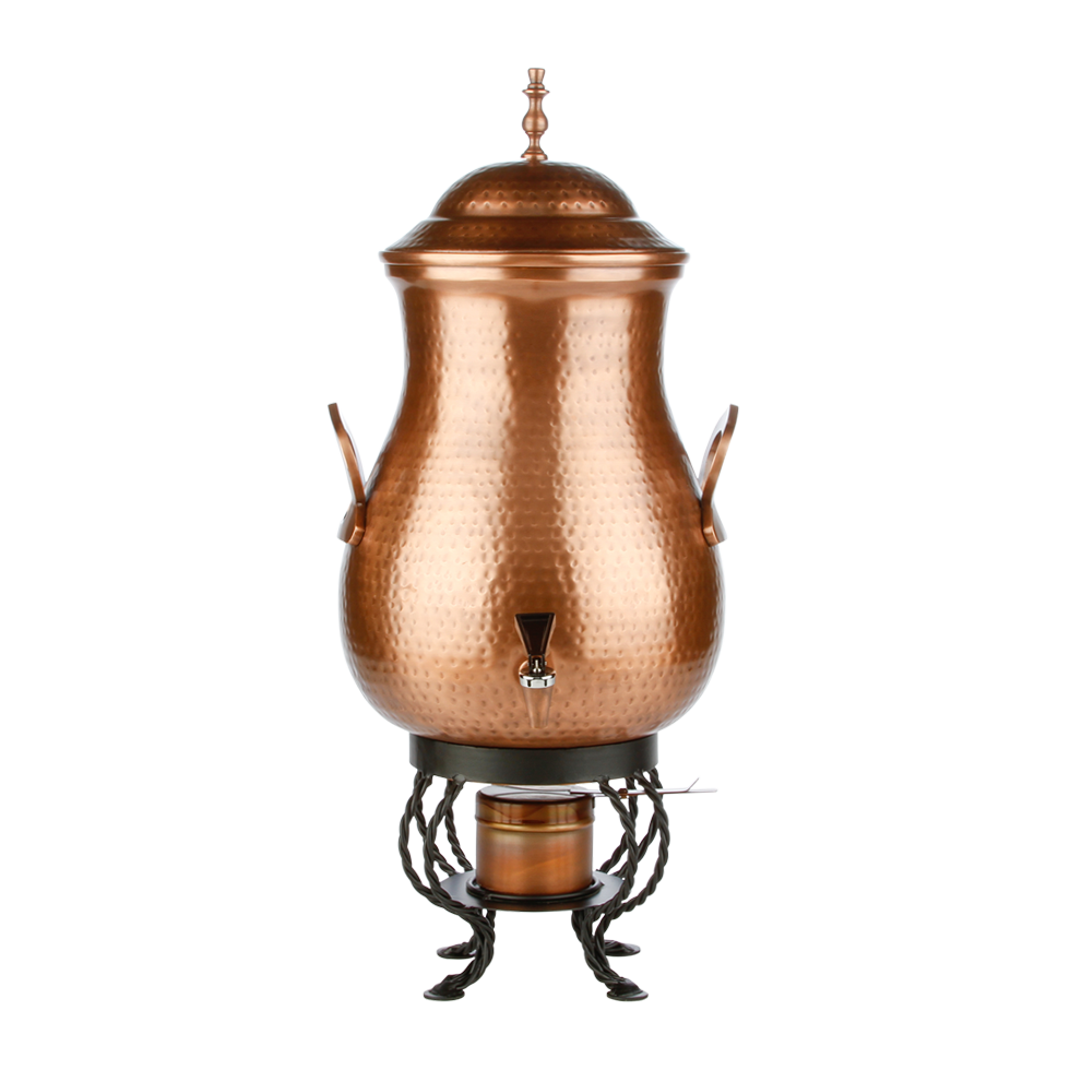 Unique hammered texture of this copper coffee urn is an excellent addition to your hot beverage service. Each urn comes with a Tomlinson faucet for ease of use. A built-in fuel holder keeps the chafing fuel securely in place. Urn has a 100 cup capacity.