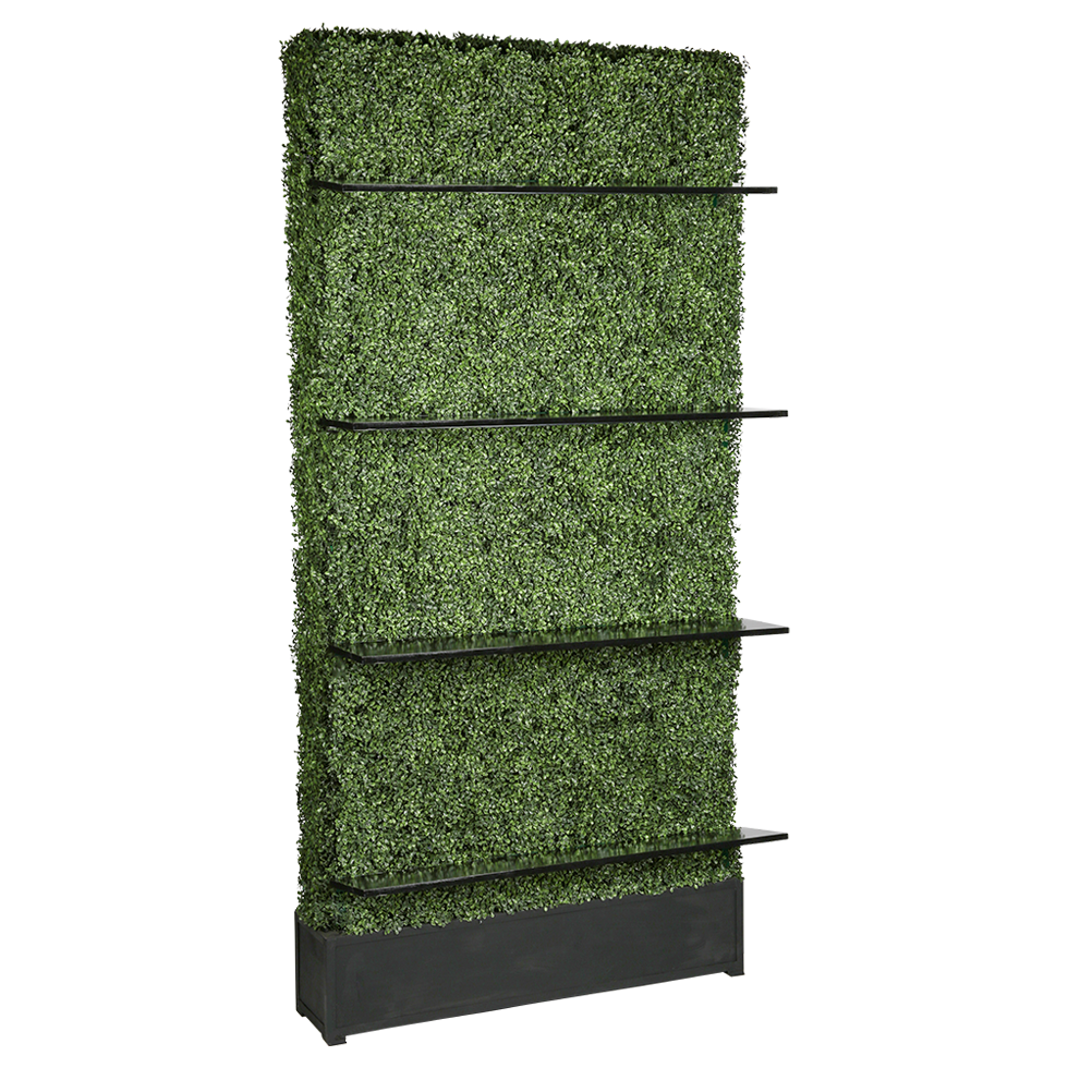Enhance your event decor with our versatile Faux Hedge Wall, complete with black display shelves. It offers standalone elegance while also serving as a captivating backdrop or backbar, perfect for showcasing glassware, favors, escort cards, and decorative accents beautifully.