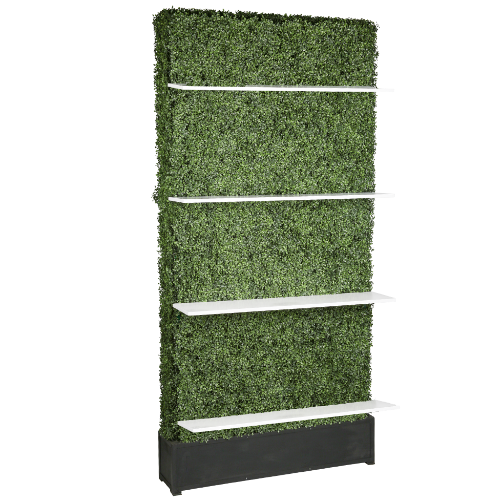 Enhance your event decor with our versatile Faux Hedge Wall, complete with white display shelves. It offers standalone elegance while also serving as a captivating backdrop or backbar, perfect for showcasing glassware, favors, escort cards, and decorative accents beautifully.