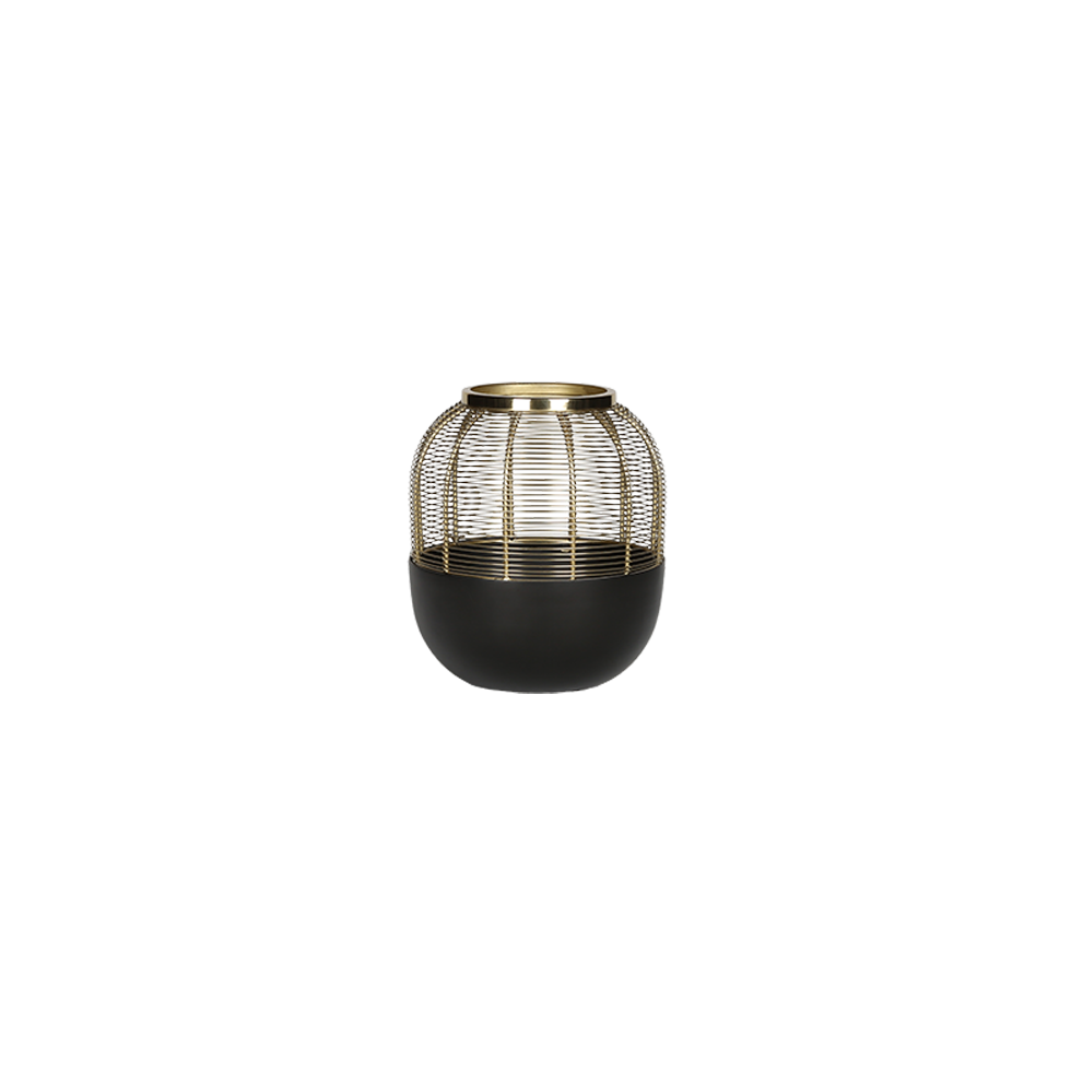 Metal Wire hurricane with gold "Hive" top and solid black bottom. Tops easily detaches to allow your creative side to shine through. LED Candles, LED wire lights, florals, greenery, etc. There is plenty of room in these modern hurricanes to dress them up or let them stand on their own. Candles are not included in the rental price. Each lantern rented separately.