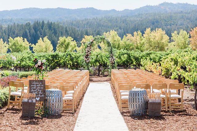 Our Natural 3-Hole Wood Folding Chairs were the perfect seating for this rustic ceremony!\u2728