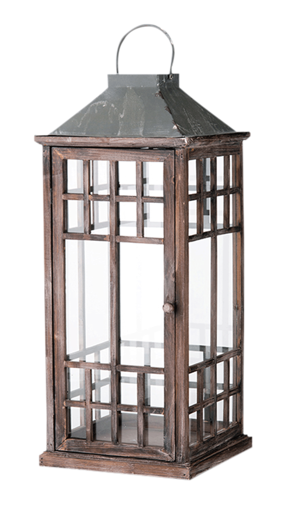 Constructed from solid wood these vintage-inspired lanterns feature a traditional window pane frame, four glass panels, and gray finish metal top with a ring handle..