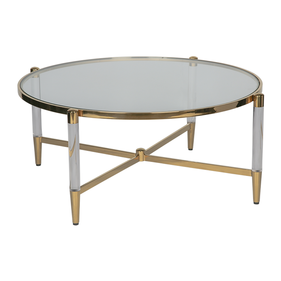Chic and sophisticated, the LouLou coffee table features a tempered glass top and gold finish slim steel frame. Accented with Lucite on the legs to compliment the delicate round glass top.