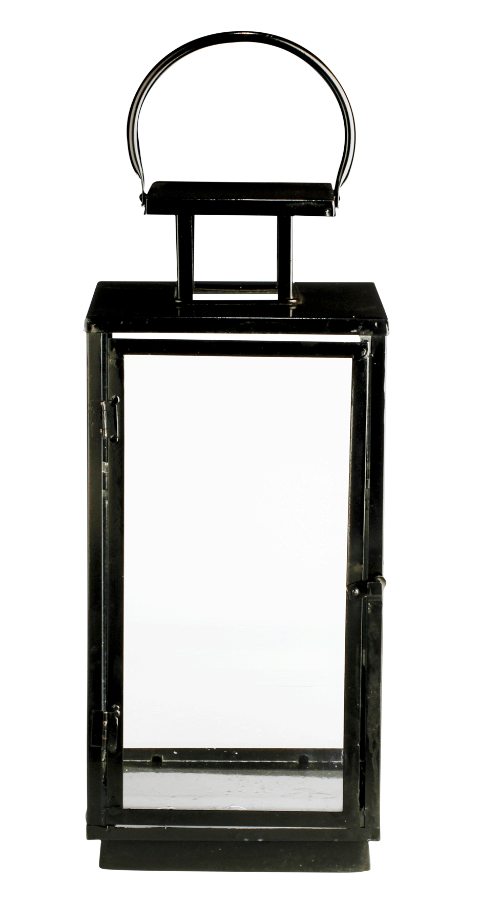A clean, modern lantern with panes of glass outlined in black metal that protect pillar candles from breezes and air currents. Accented with a round black metal handle.