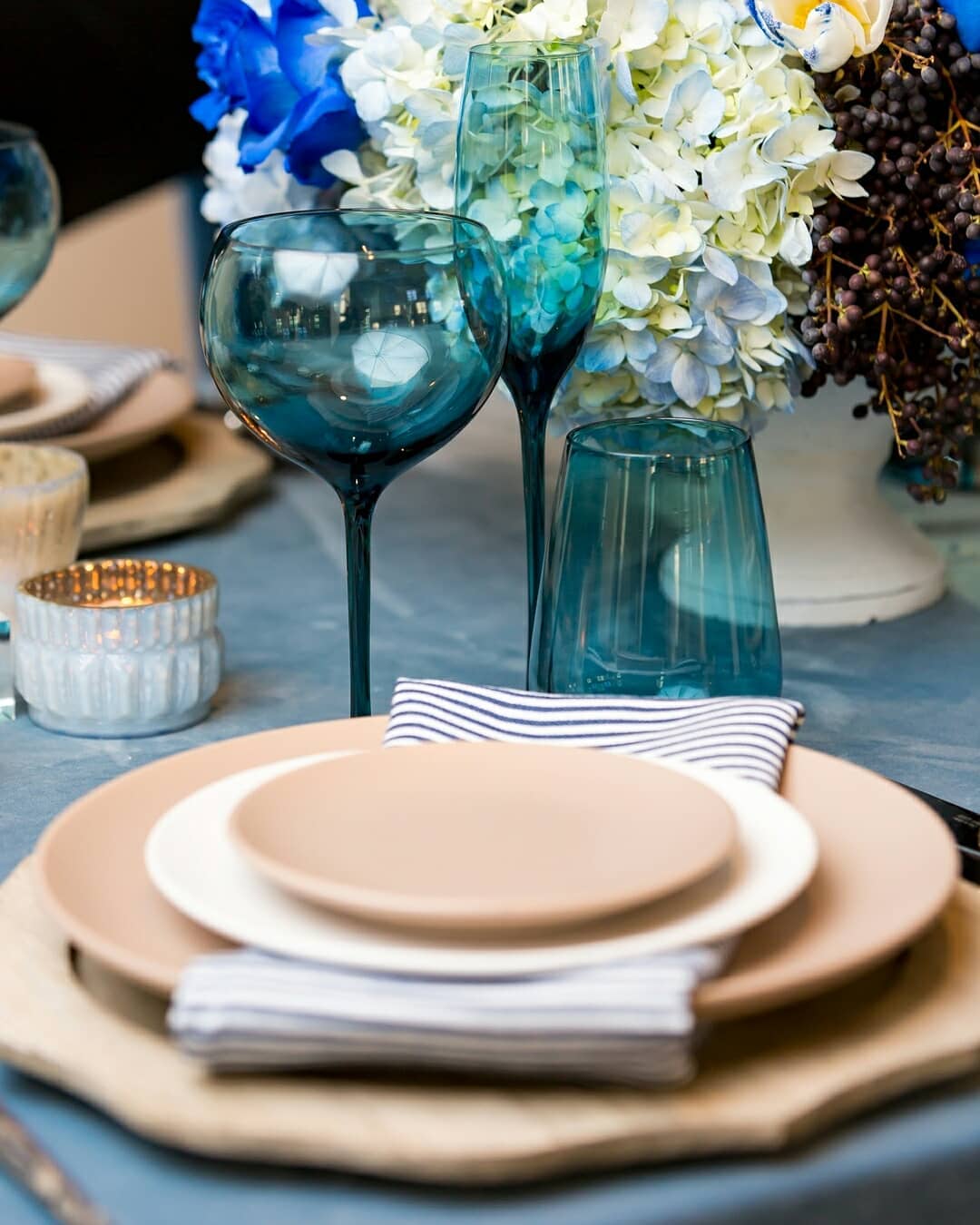 Invite BLUE as your guest of honor for your reception! A table adorned with our Sapphire Blue Hepburn Stemware - matched exquisitely with our Grey Wash...
