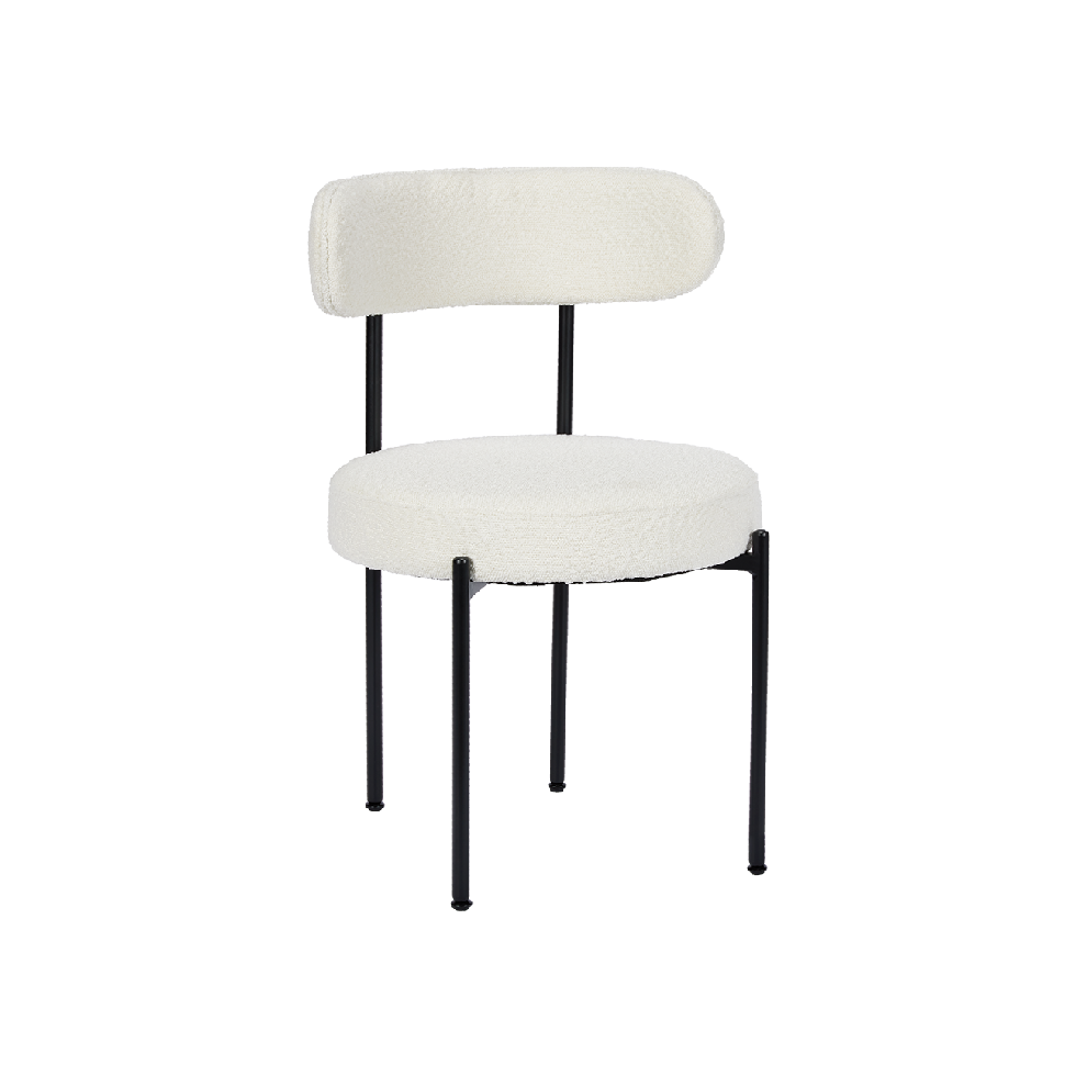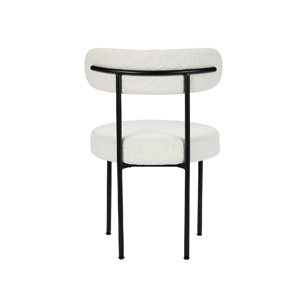 Experience the perfect blend of coolness and comfort with the all-new Marilyn Chair. Its sleek matte black frame gracefully enhances the textured White Dove Boucle upholstery, resulting in an ambiance that effortlessly ex udes chicness. Designed with a captivating round curved seat and back, this chair effortlessly combines elegance and glamour for your nex t event.